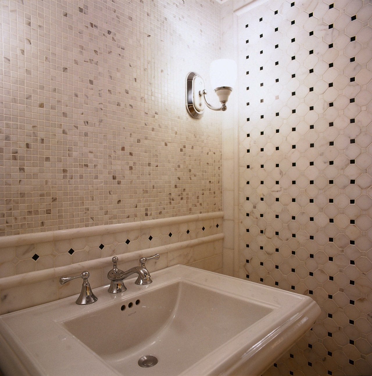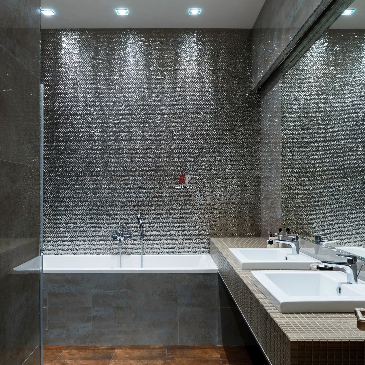Плитка мрамор и дерево и мозайка в ванной