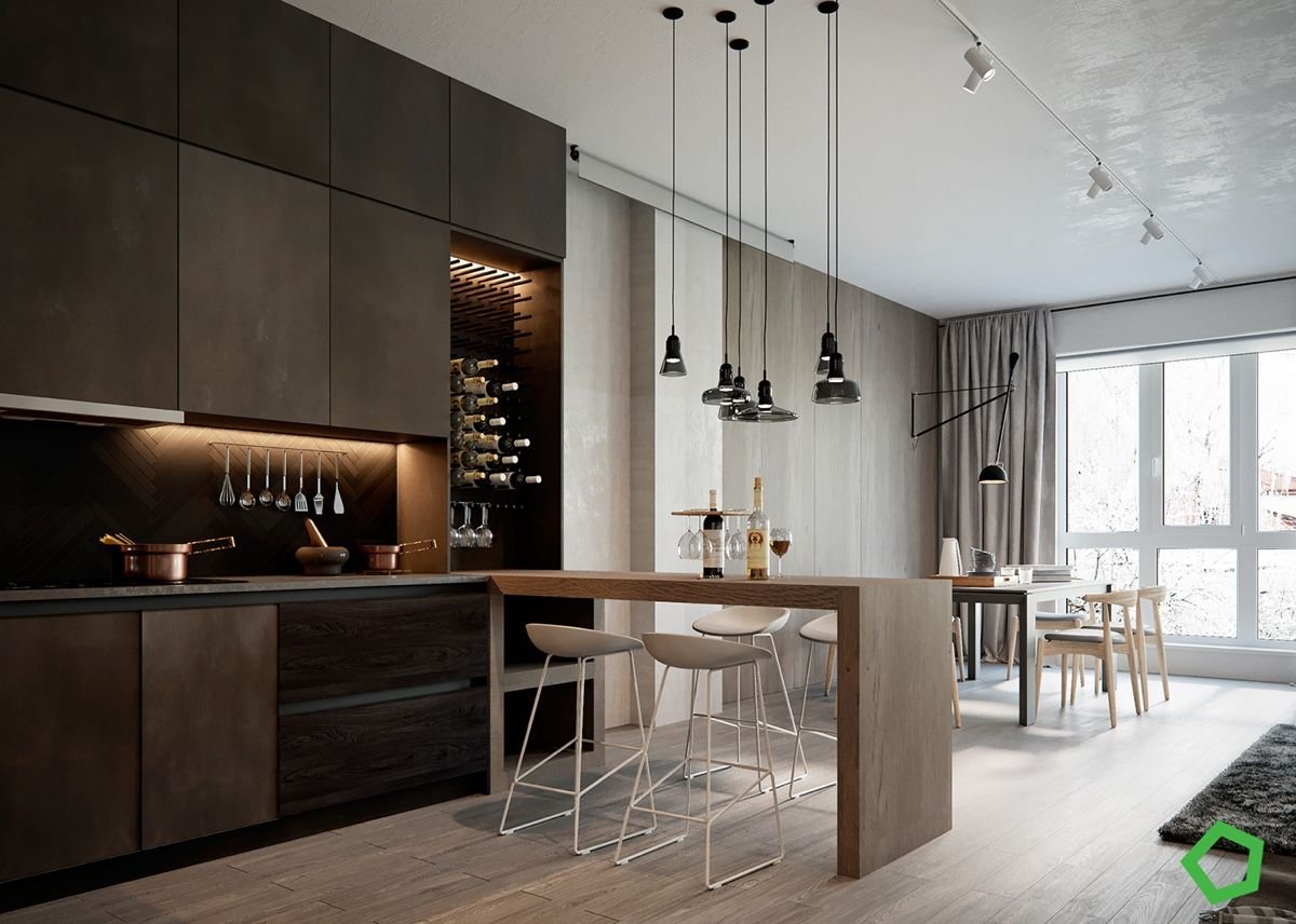 Кухня студия с барной стойкой