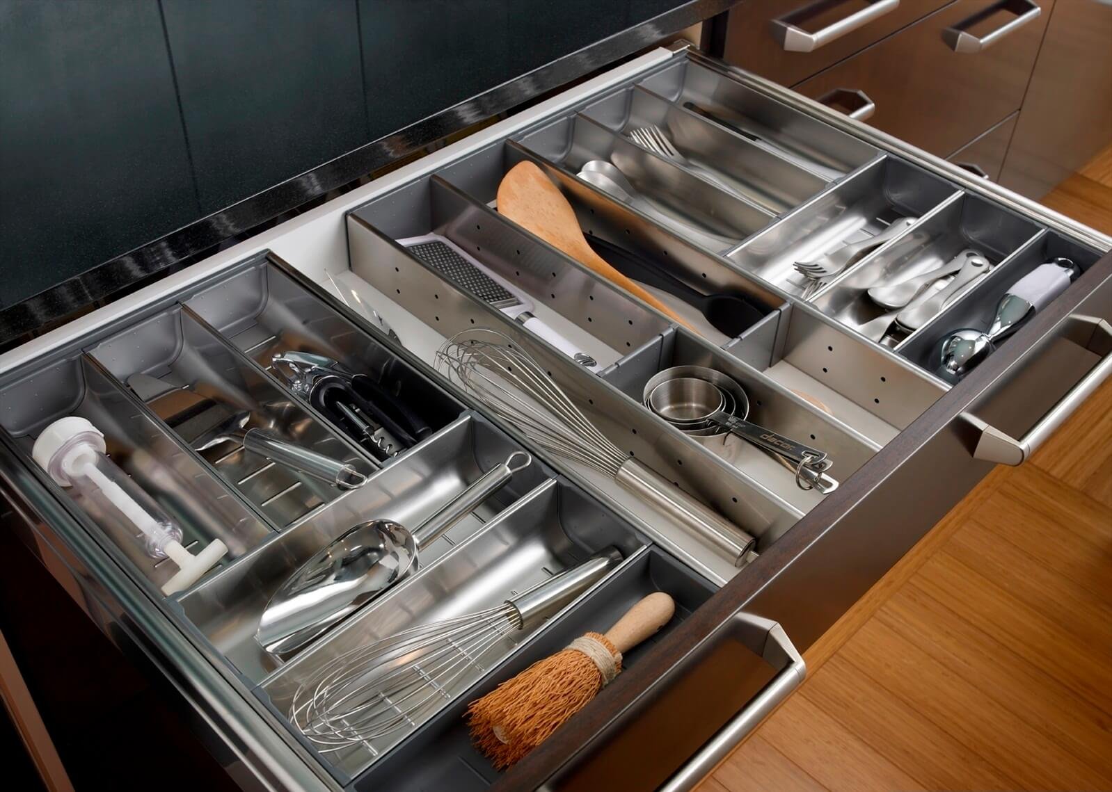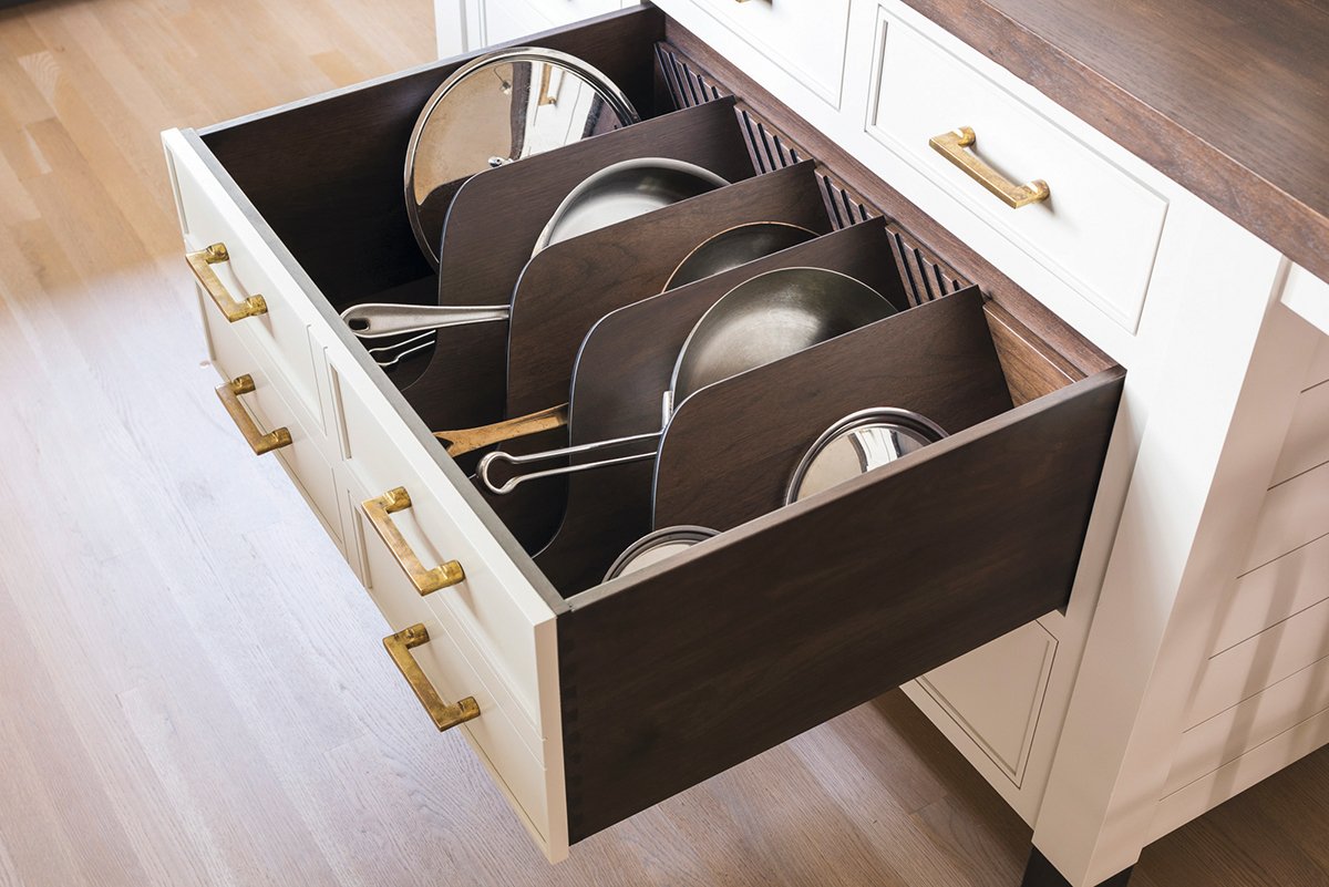 Хранение посуды в выдвижных ящиках