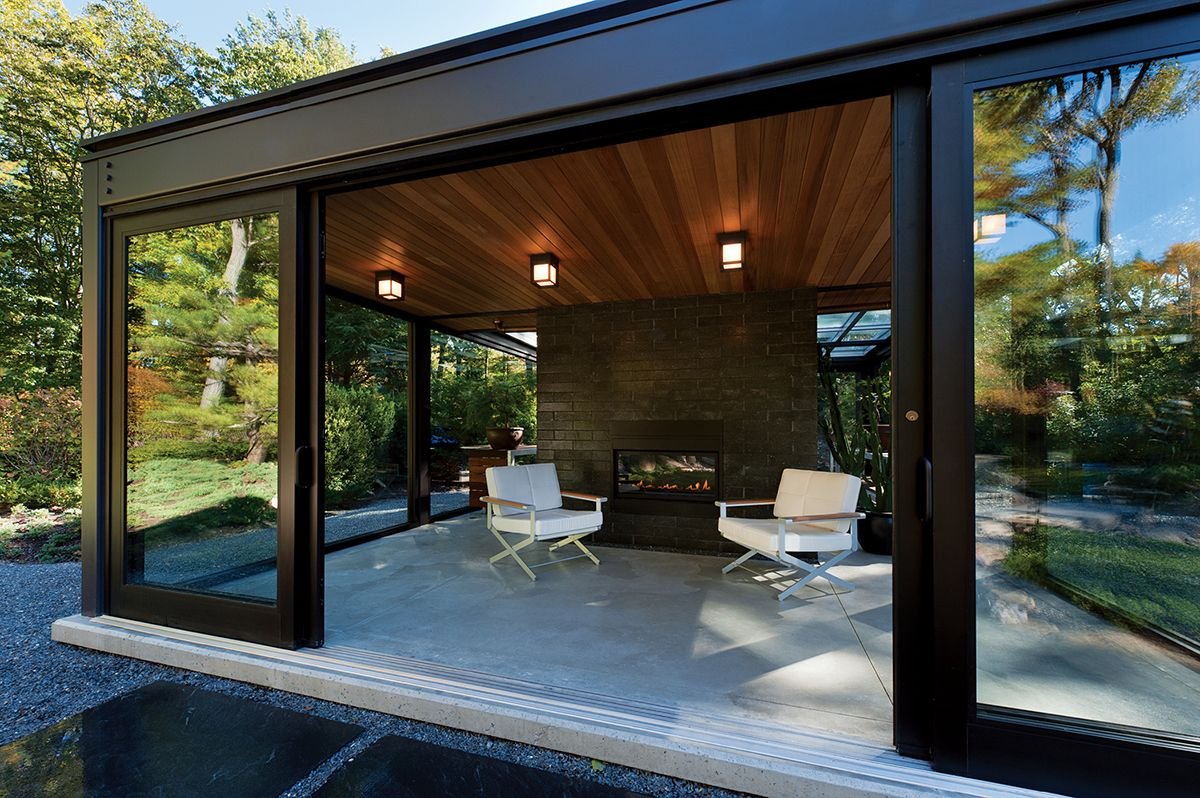 Веранда с панорамными окнами и камином