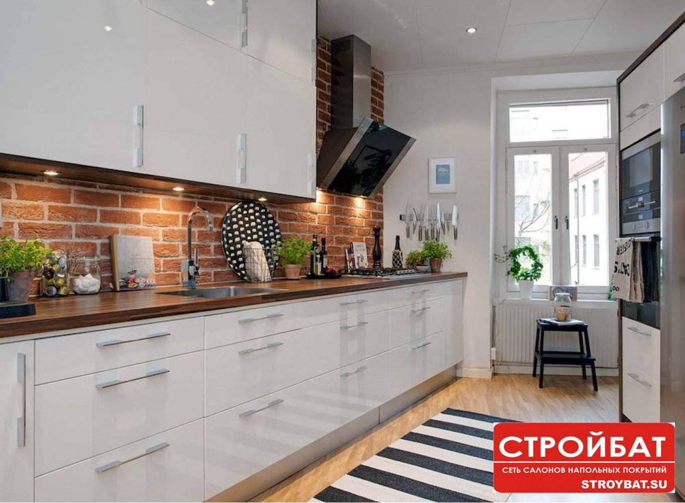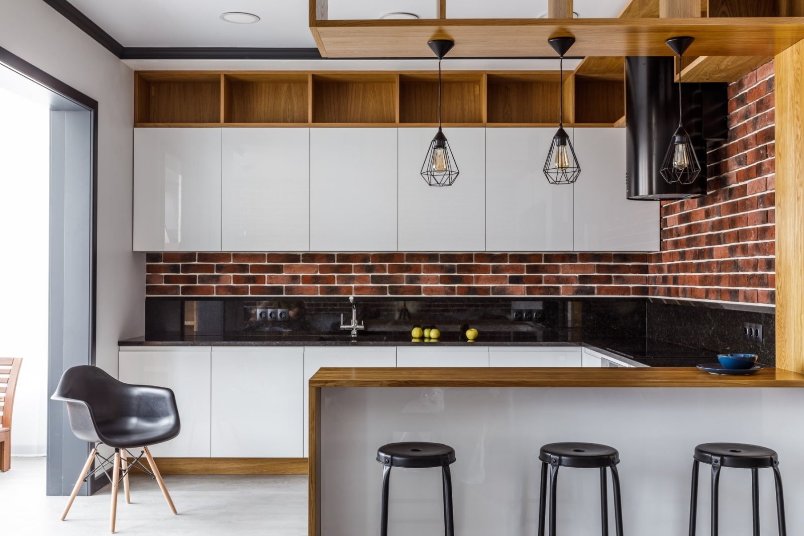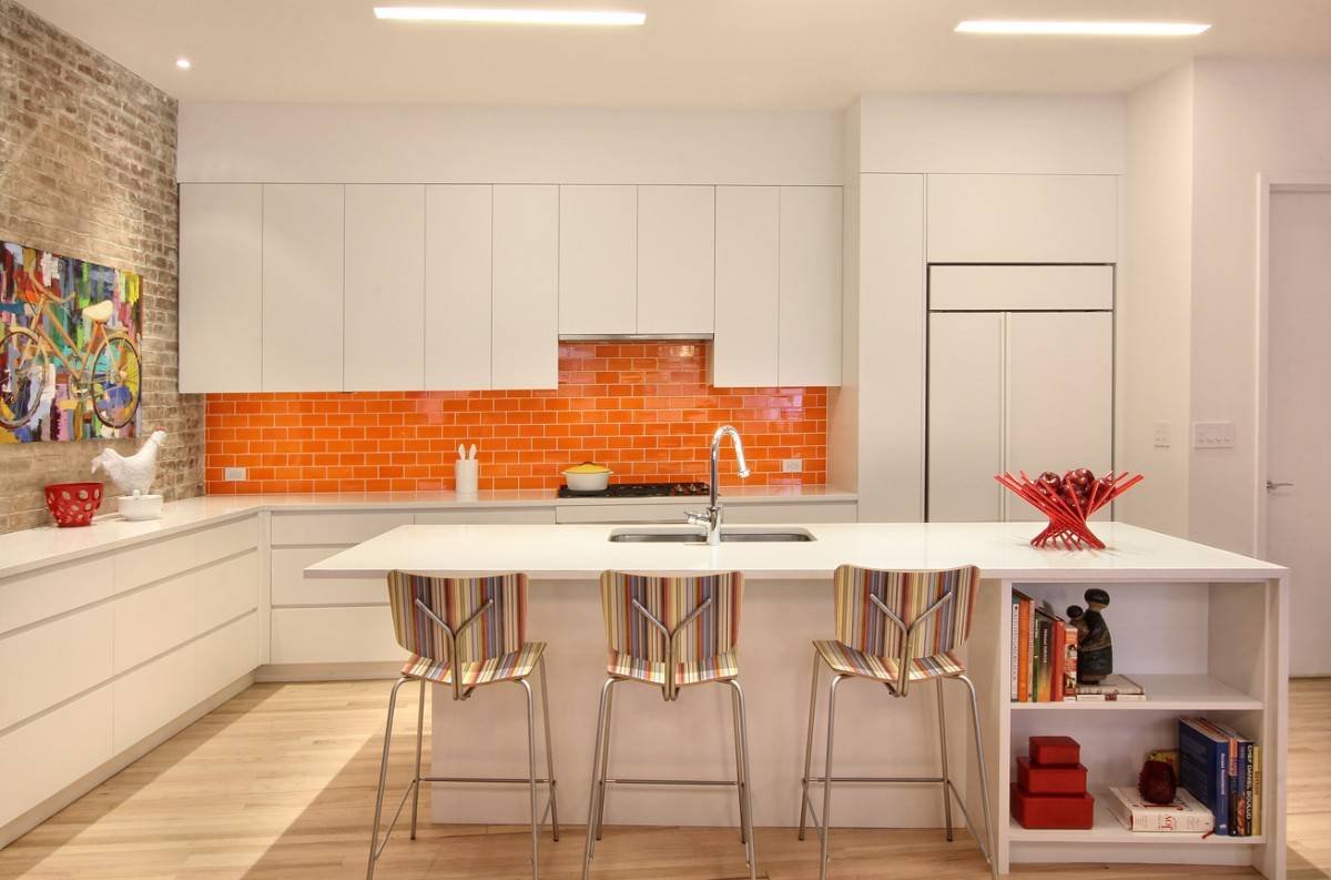 Белая кухня с кирпичным фартуком