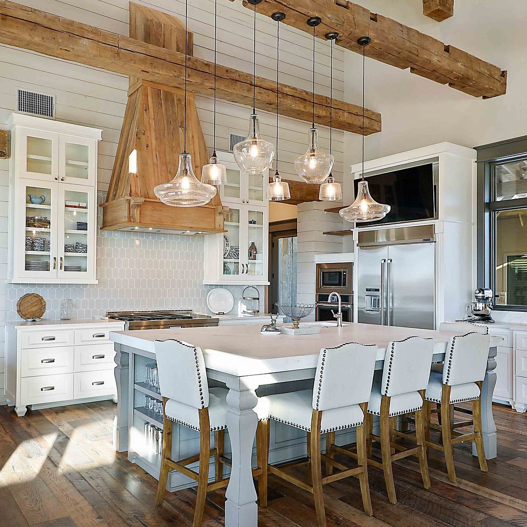 Кухня с островом в деревянном доме