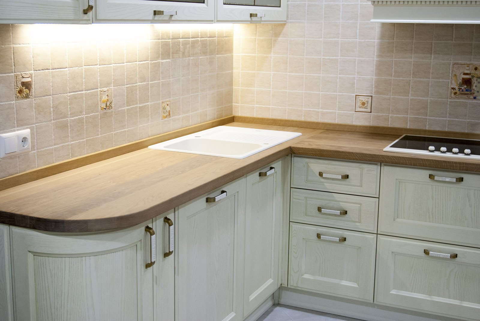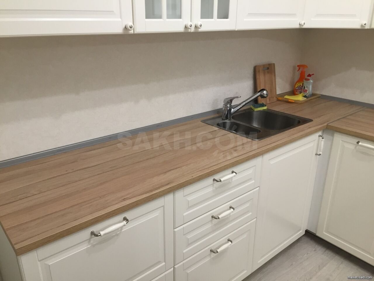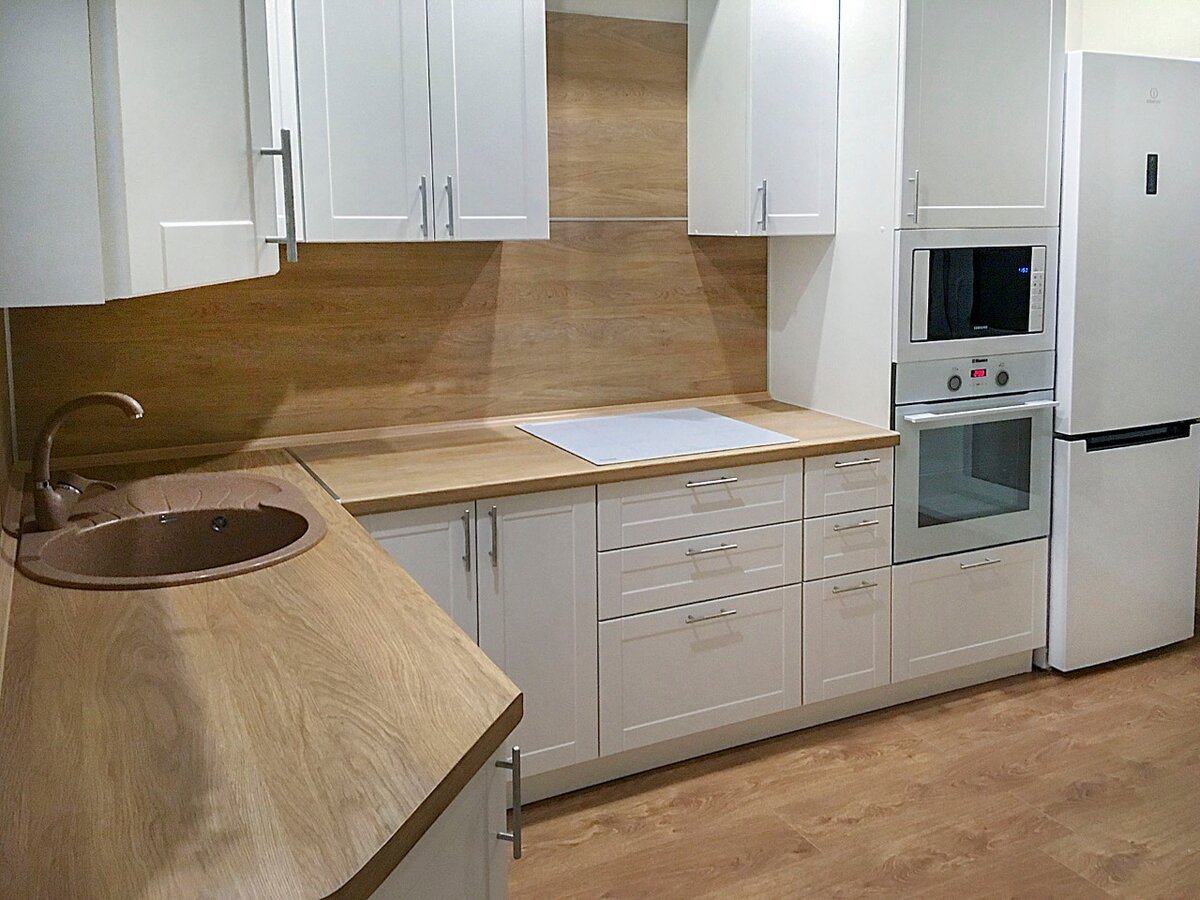 Белая кухня с деревянной столешницей