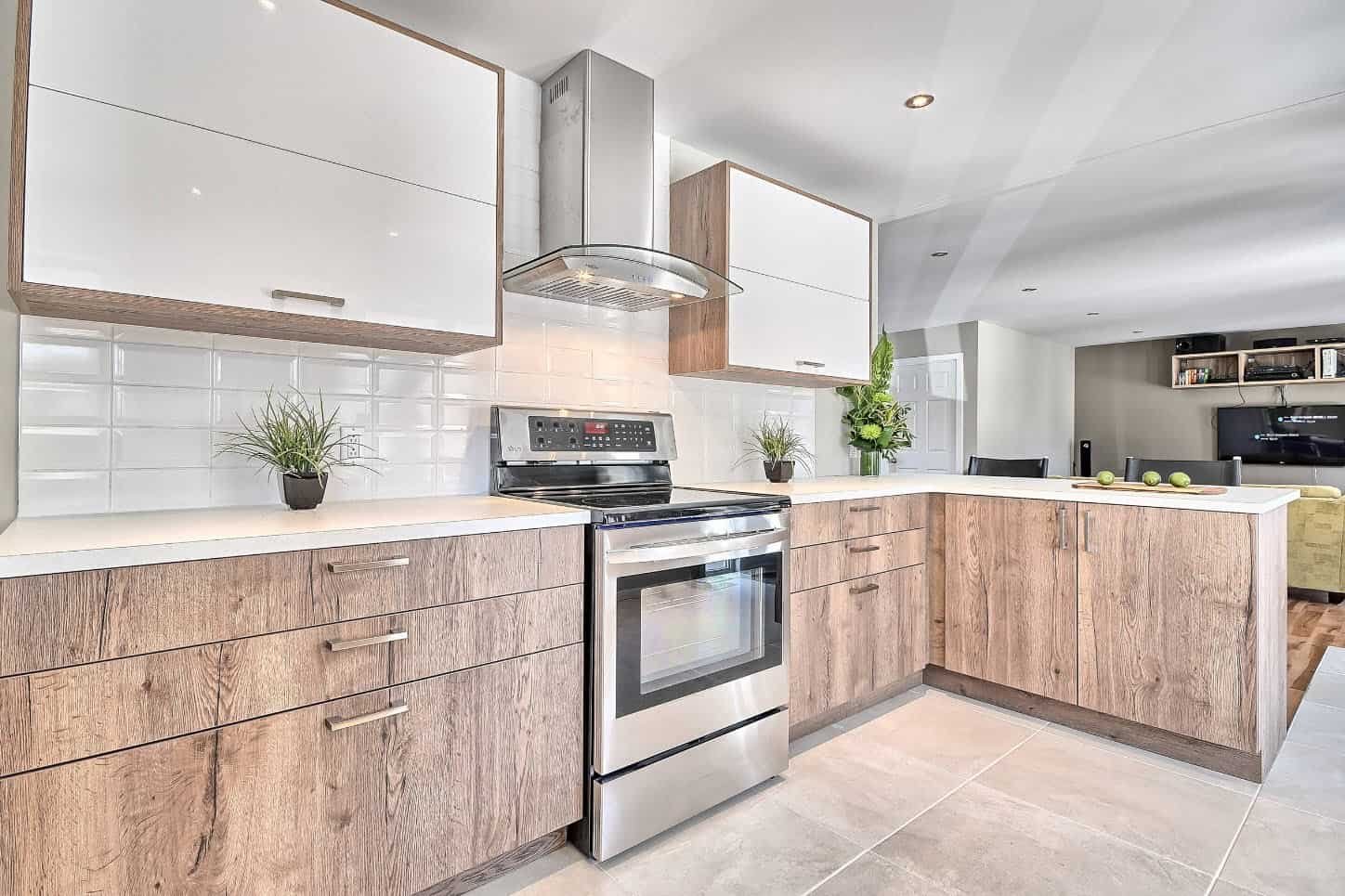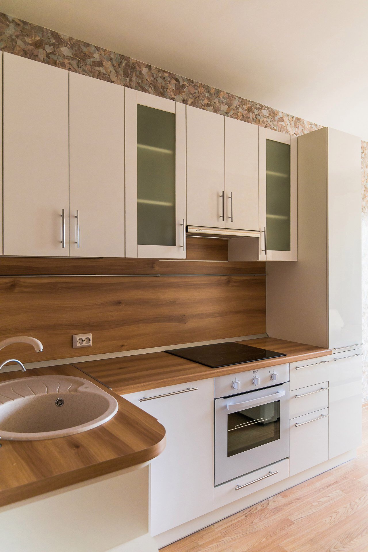 Бежевая кухня со столешницей под дерево