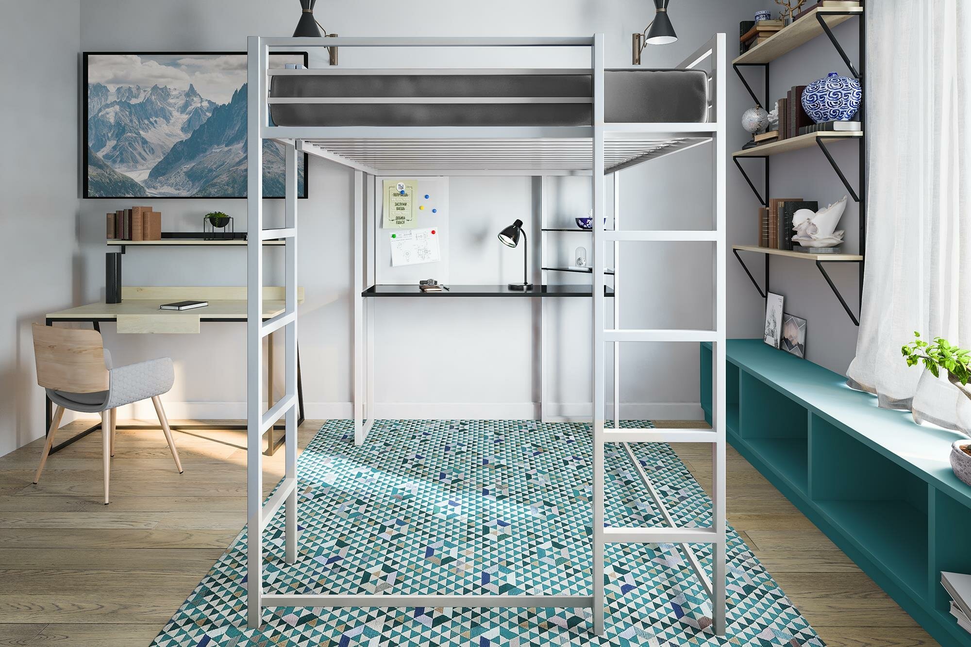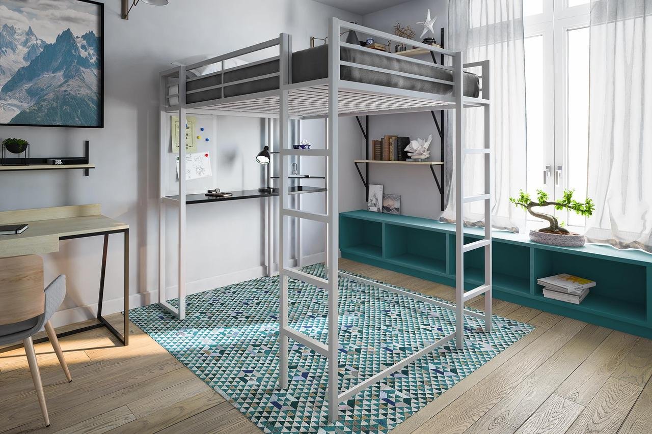 Чердак кровать металлическая белая в интерьере