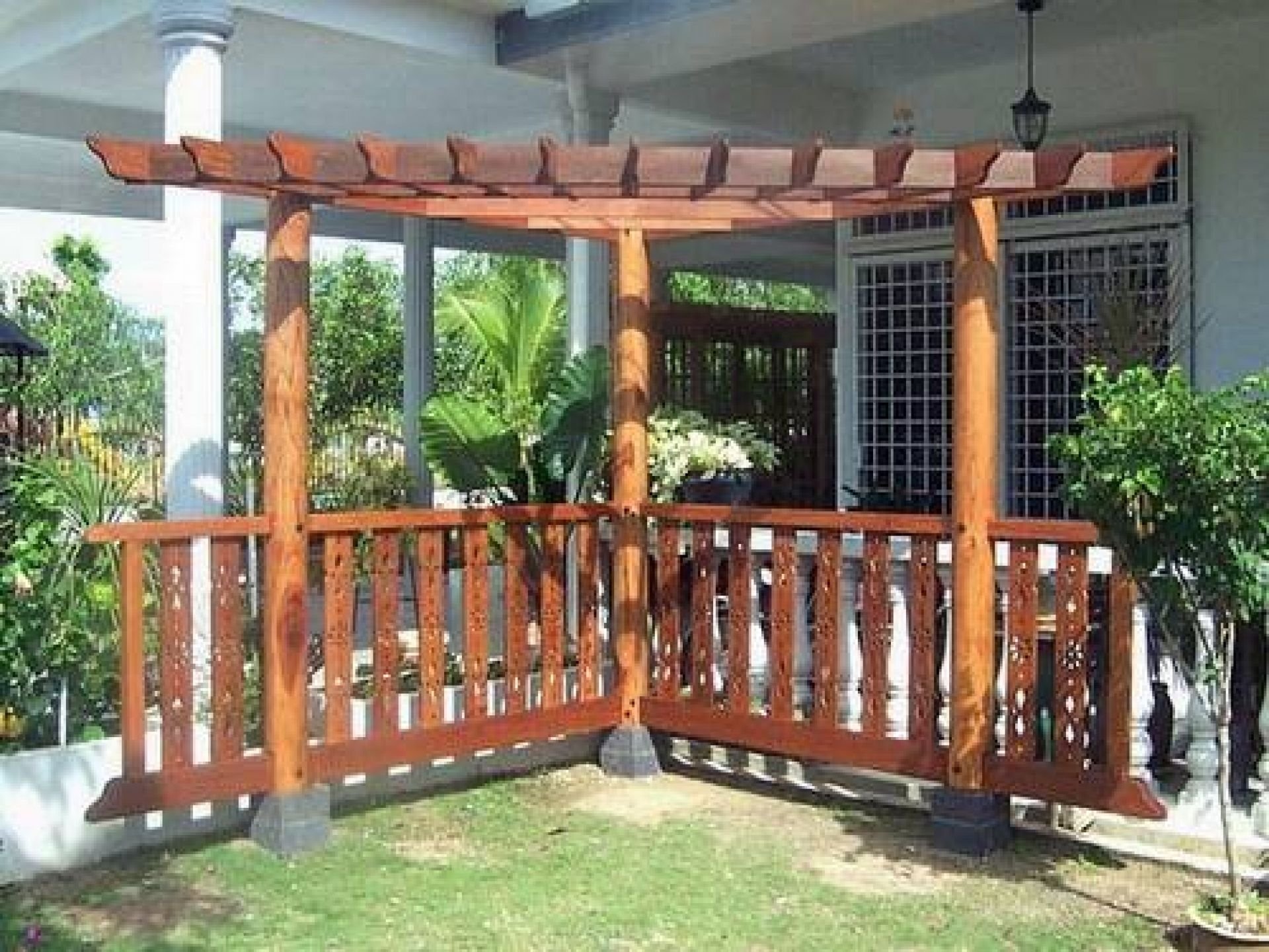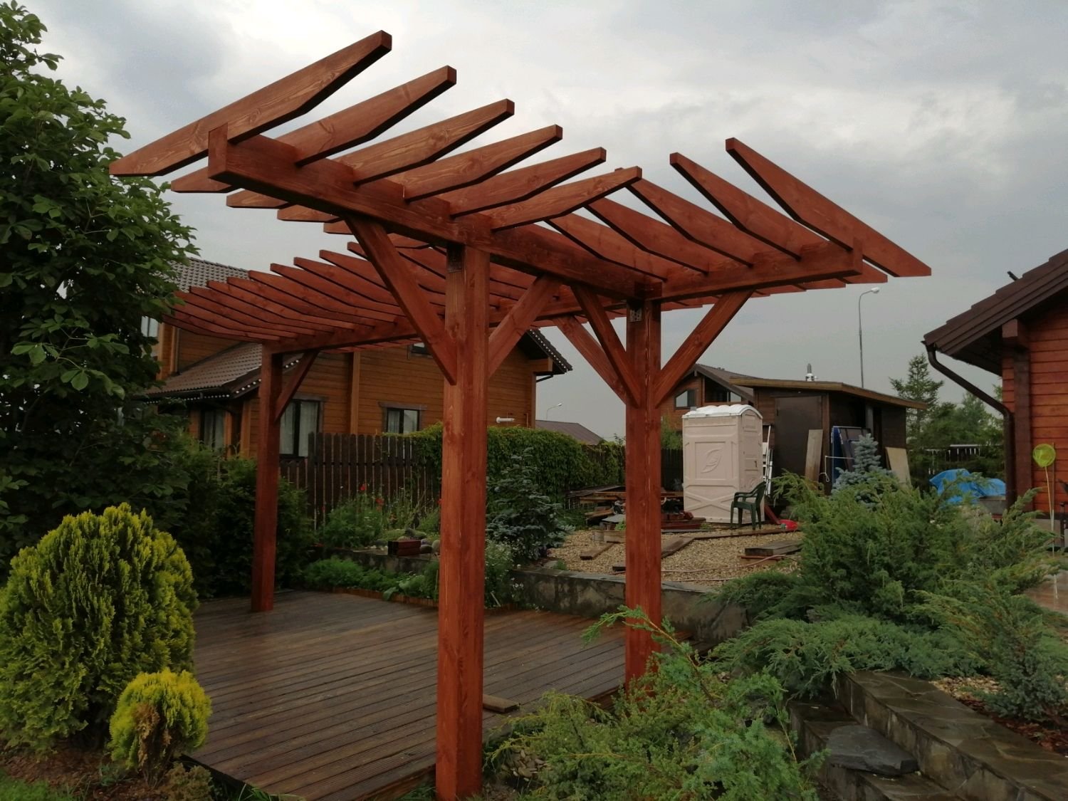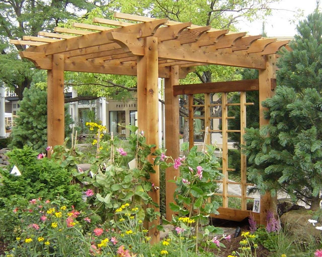 Пергола деревянная в углу участка