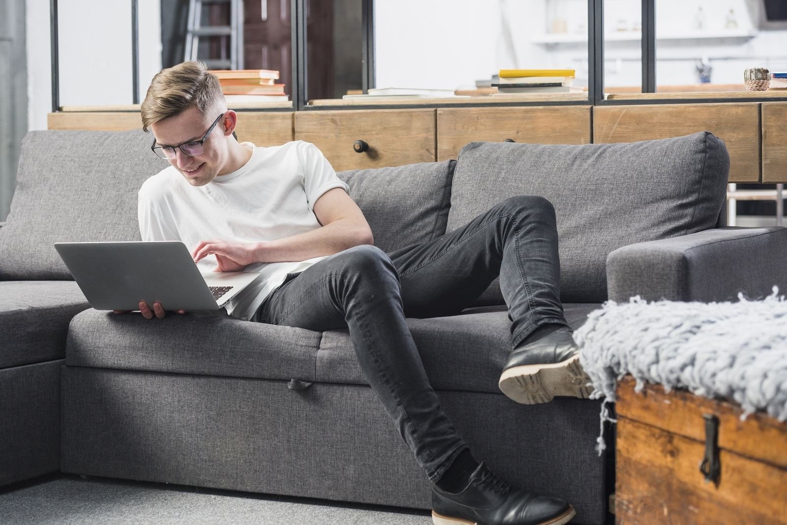 Парень на диване с ноутбуком