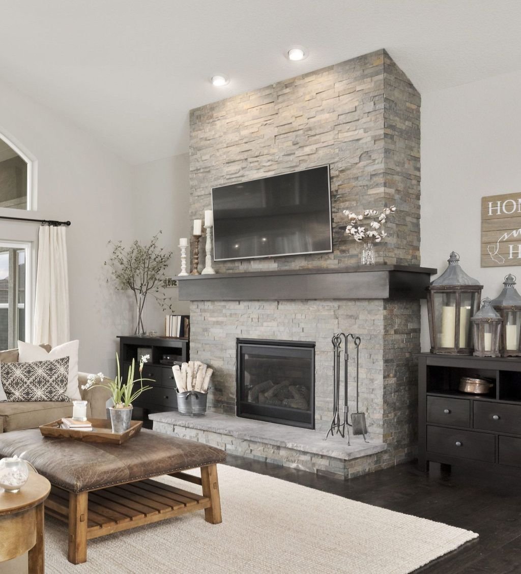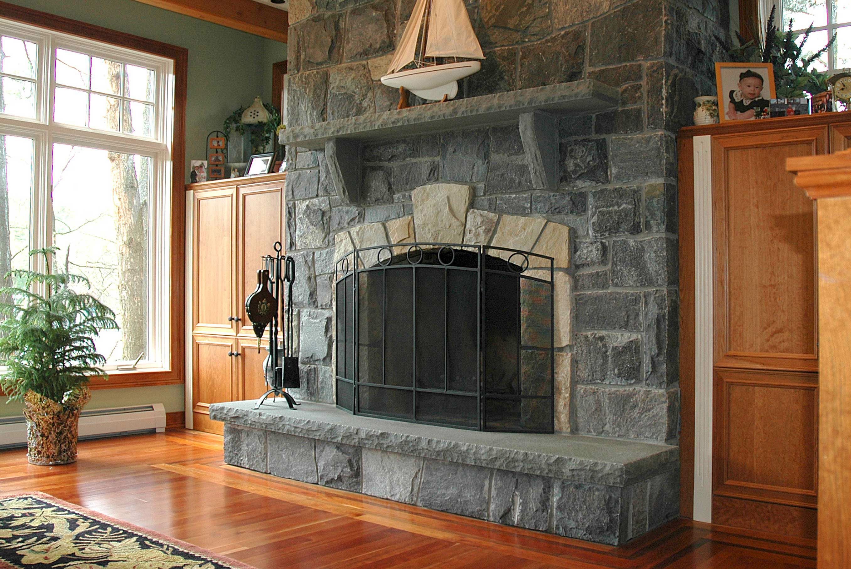 Камин в доме из камня серый