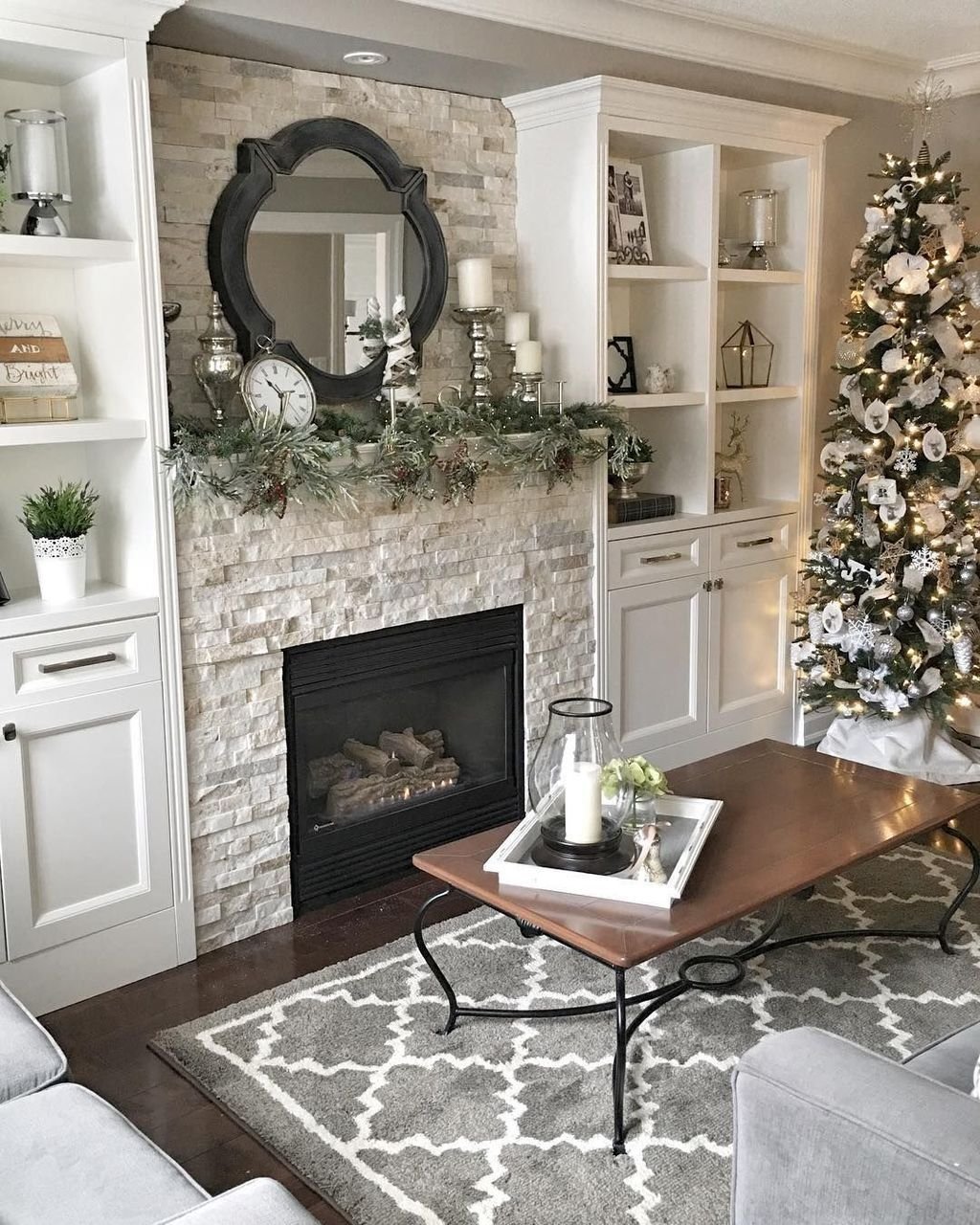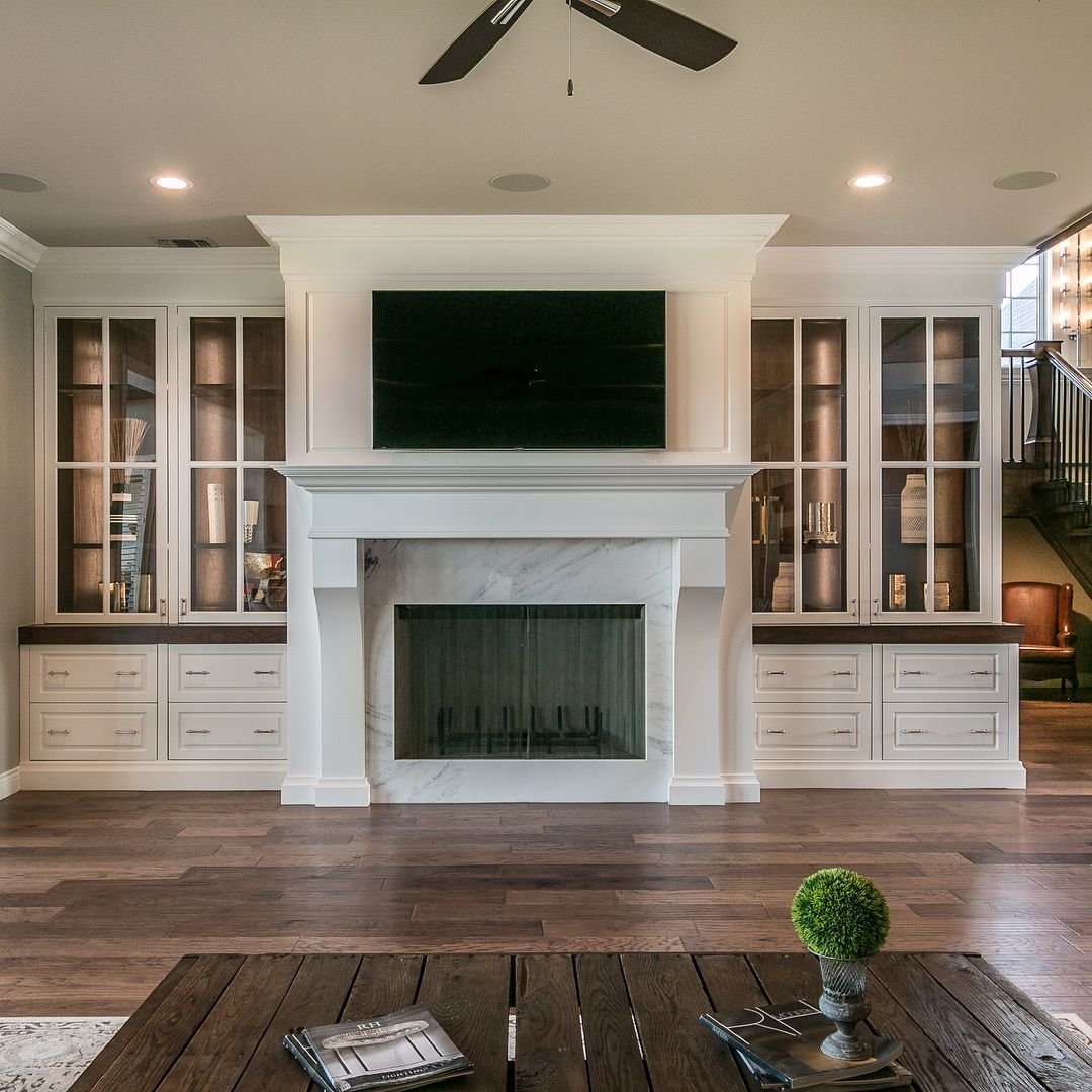 Гостиная с камином и шкафами