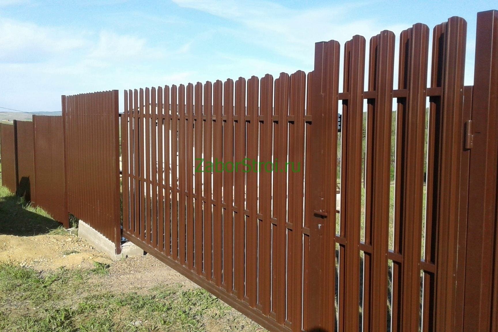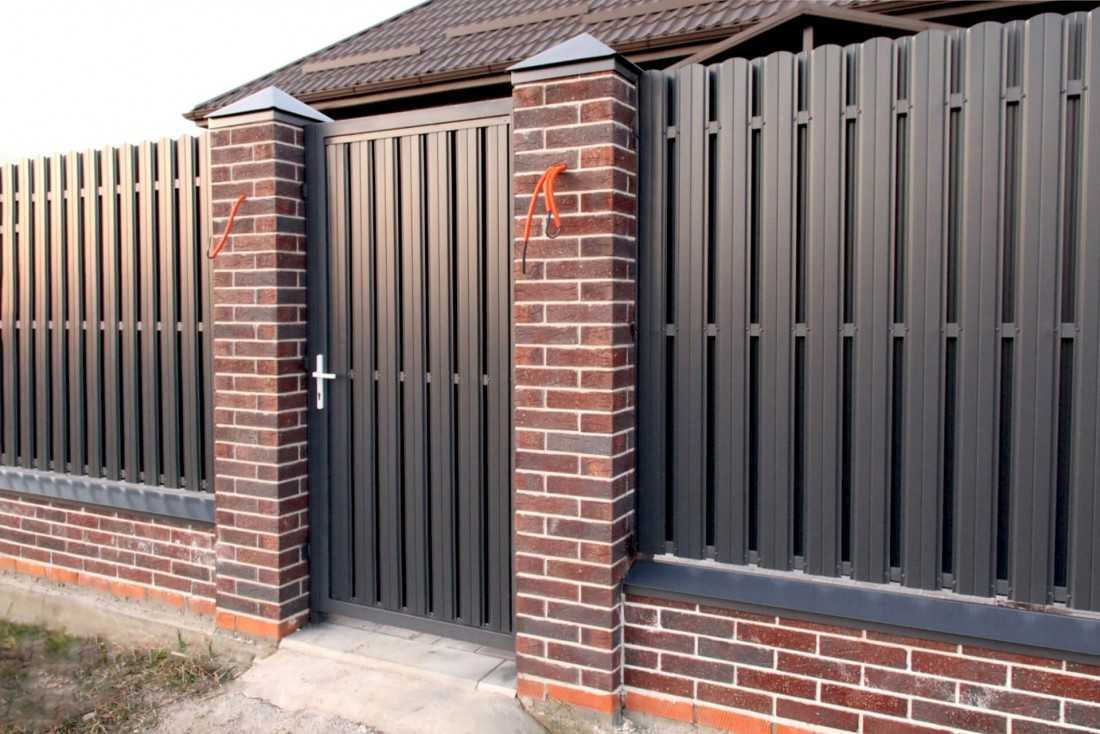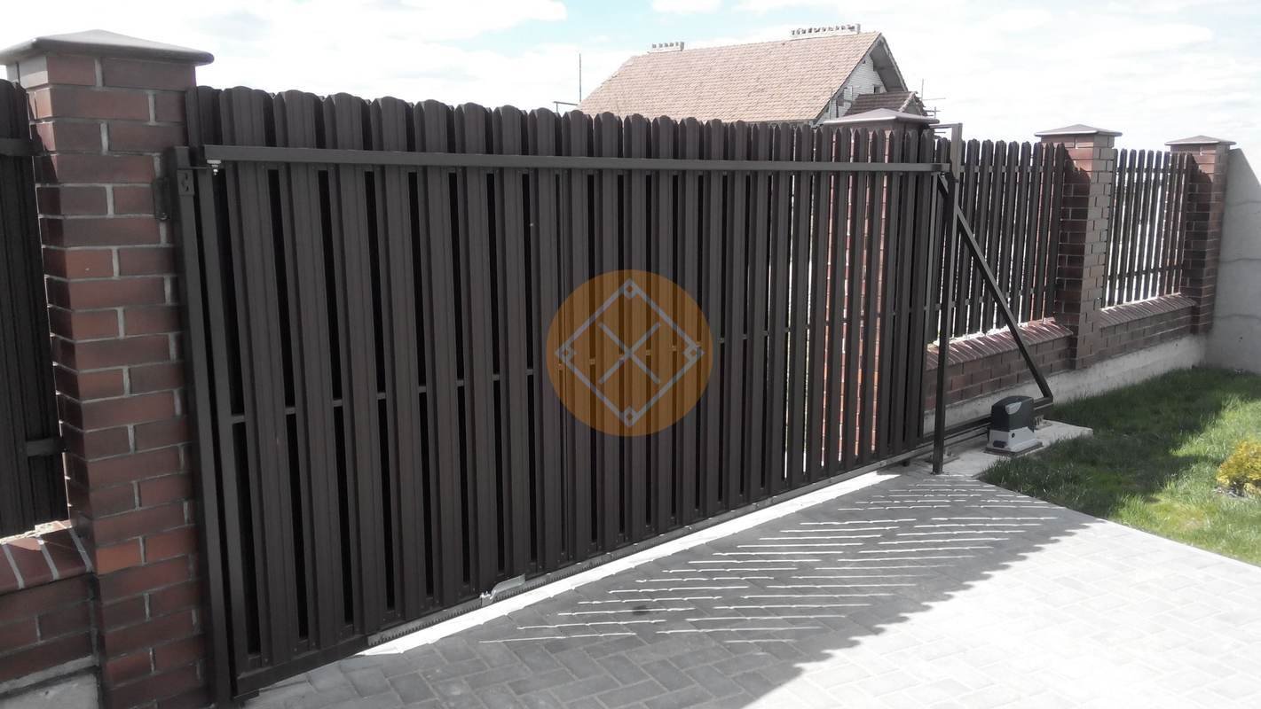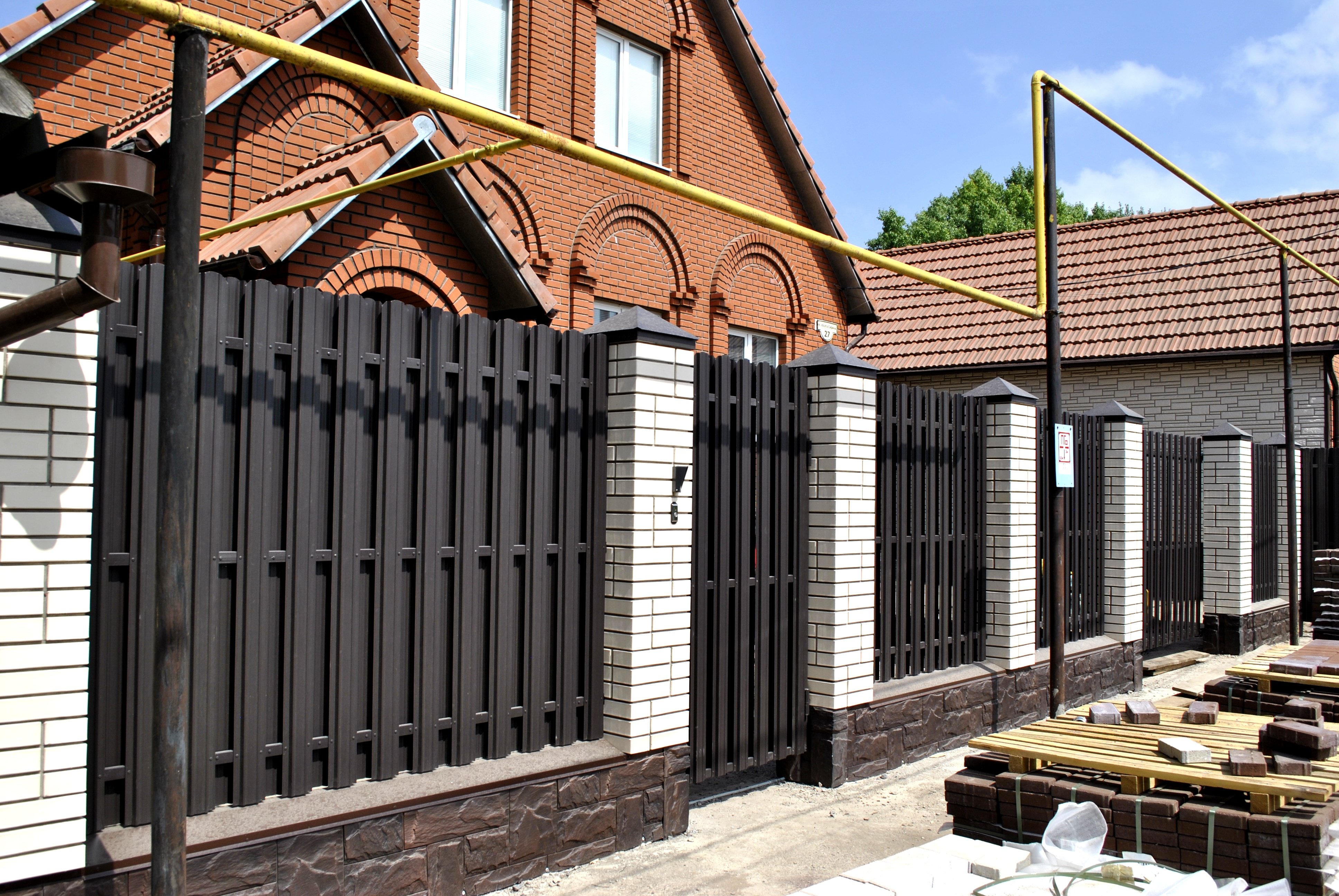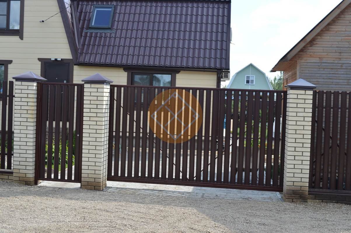 Заборы из евроштакетника с кирпичными столбами и откатными воротами