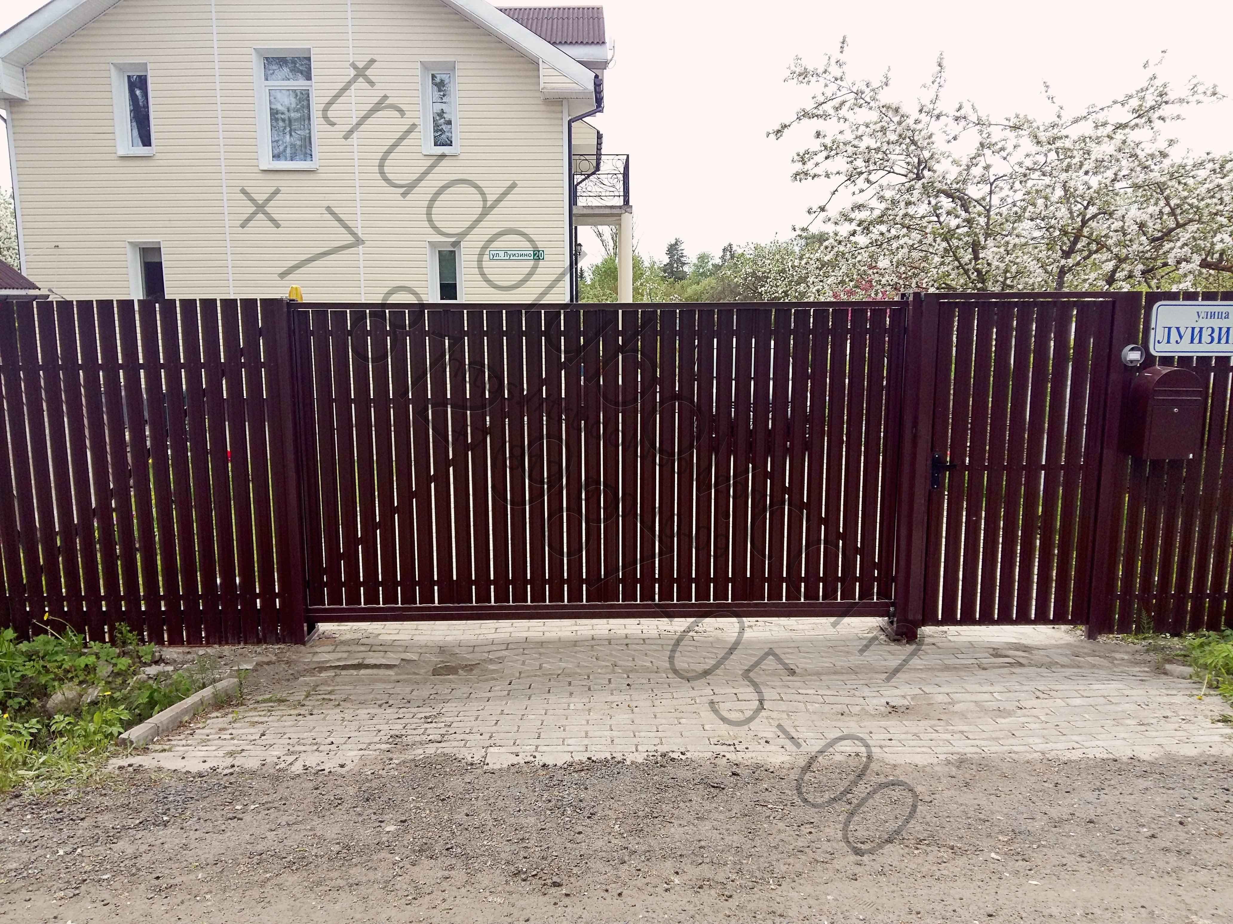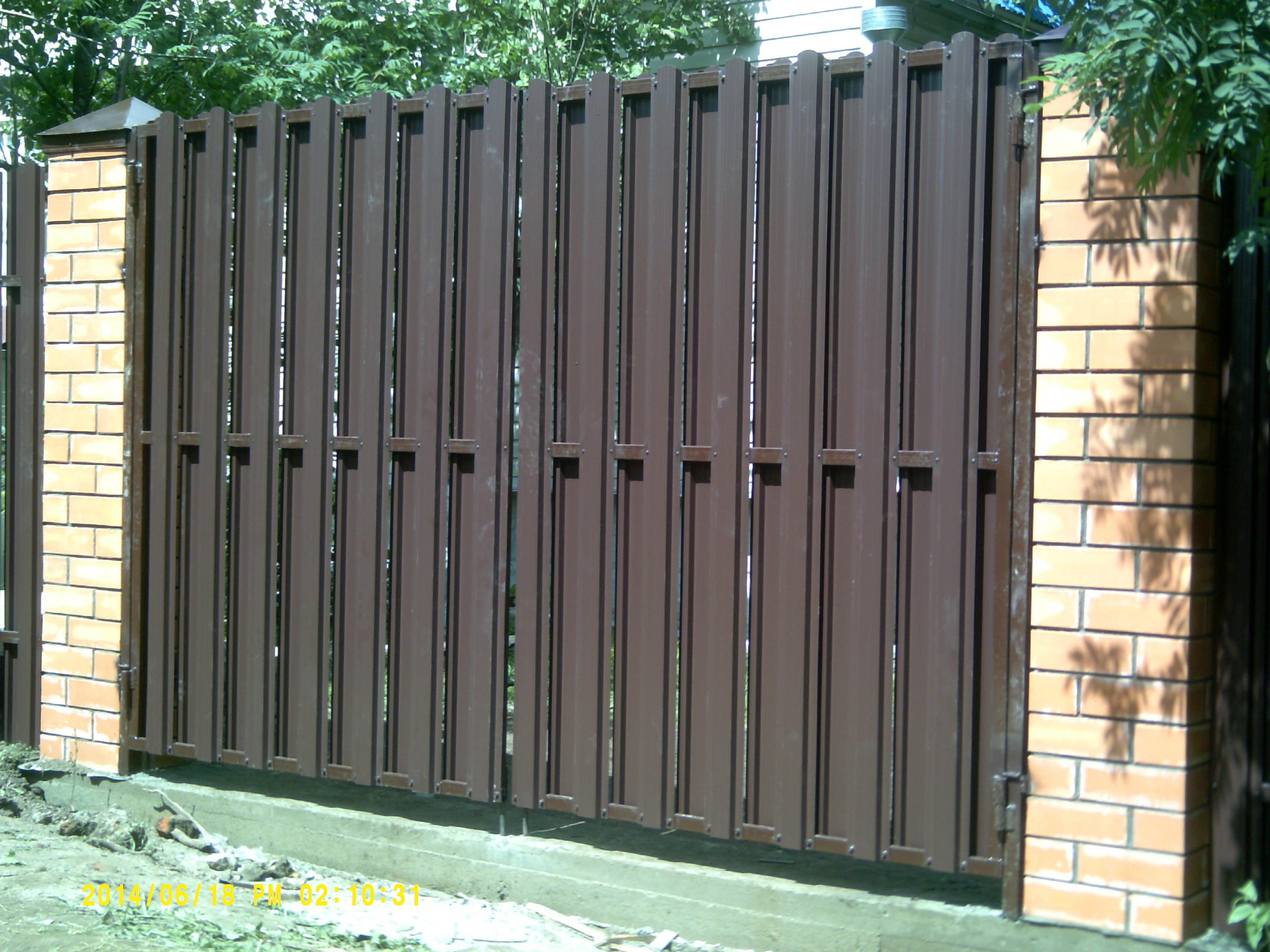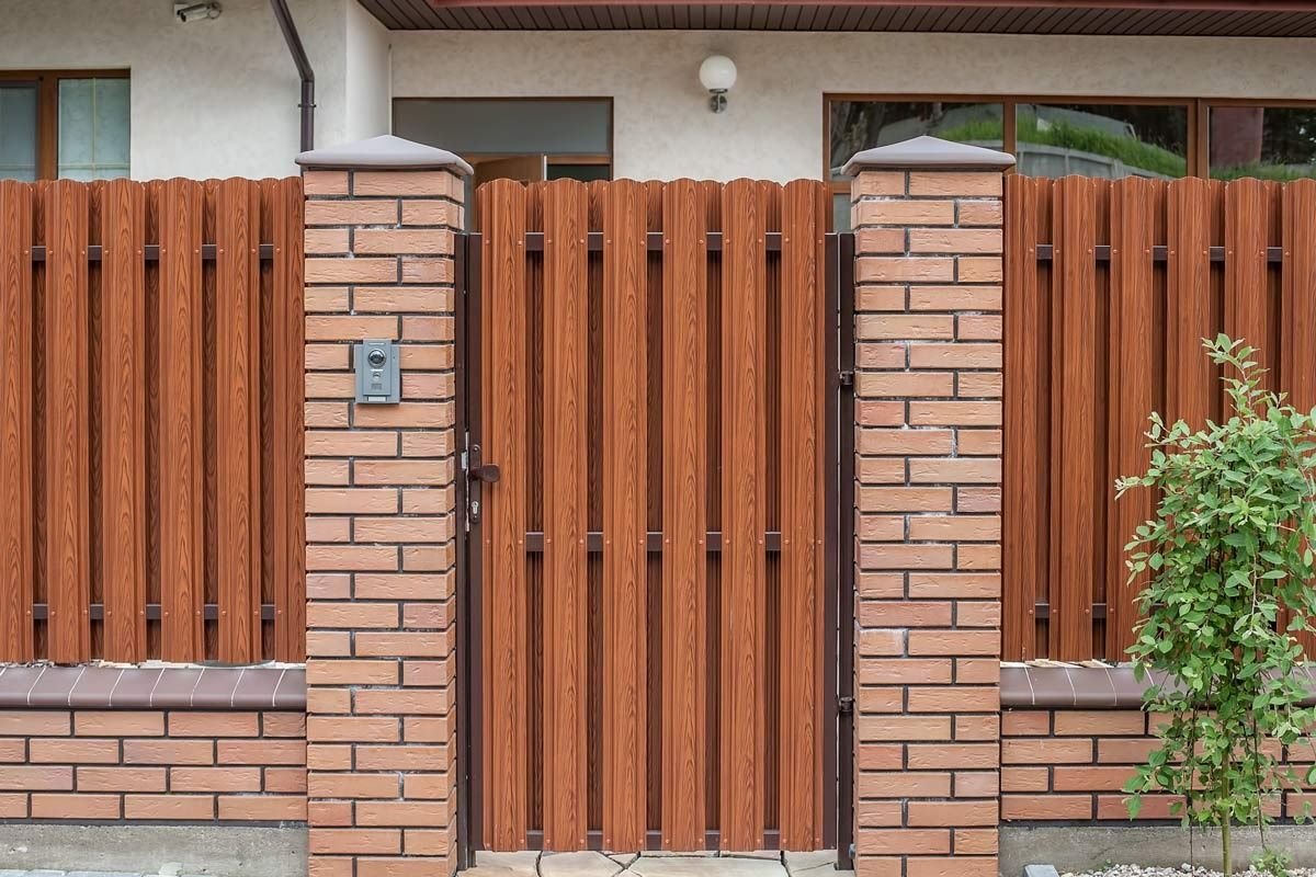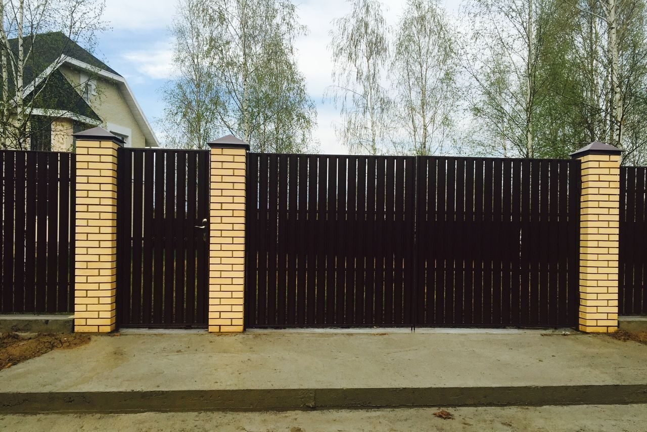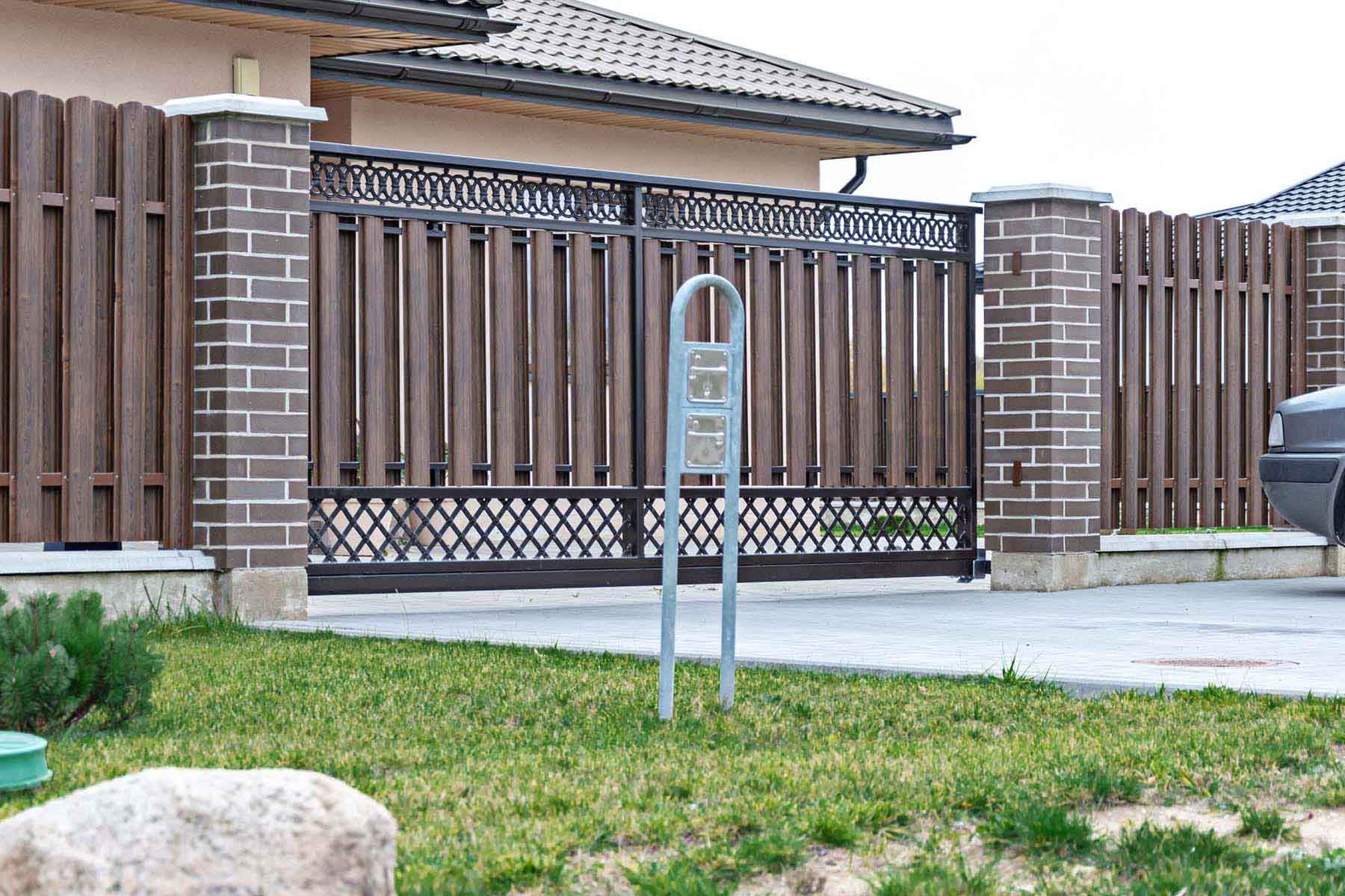 Заборы из евроштакетника с кирпичными столбами и откатными воротами