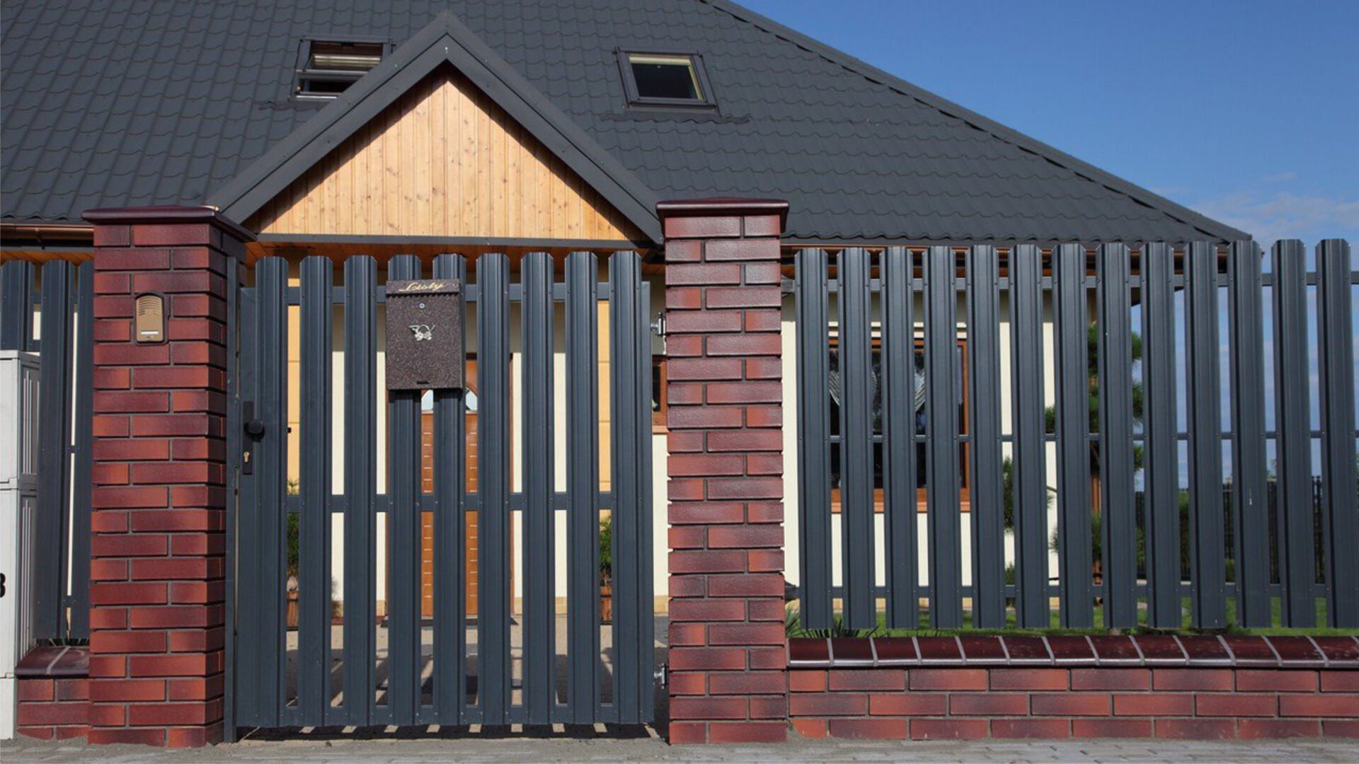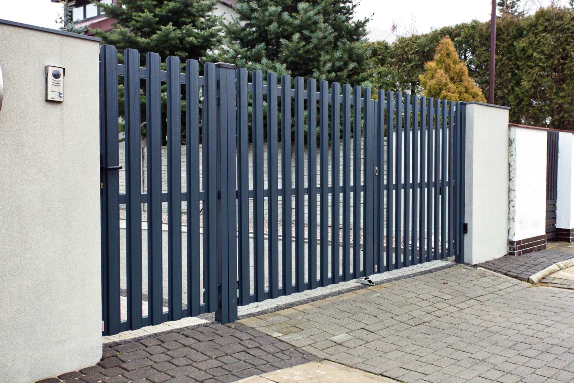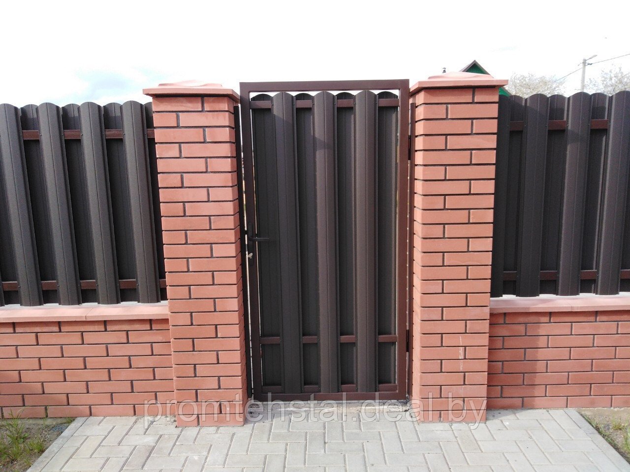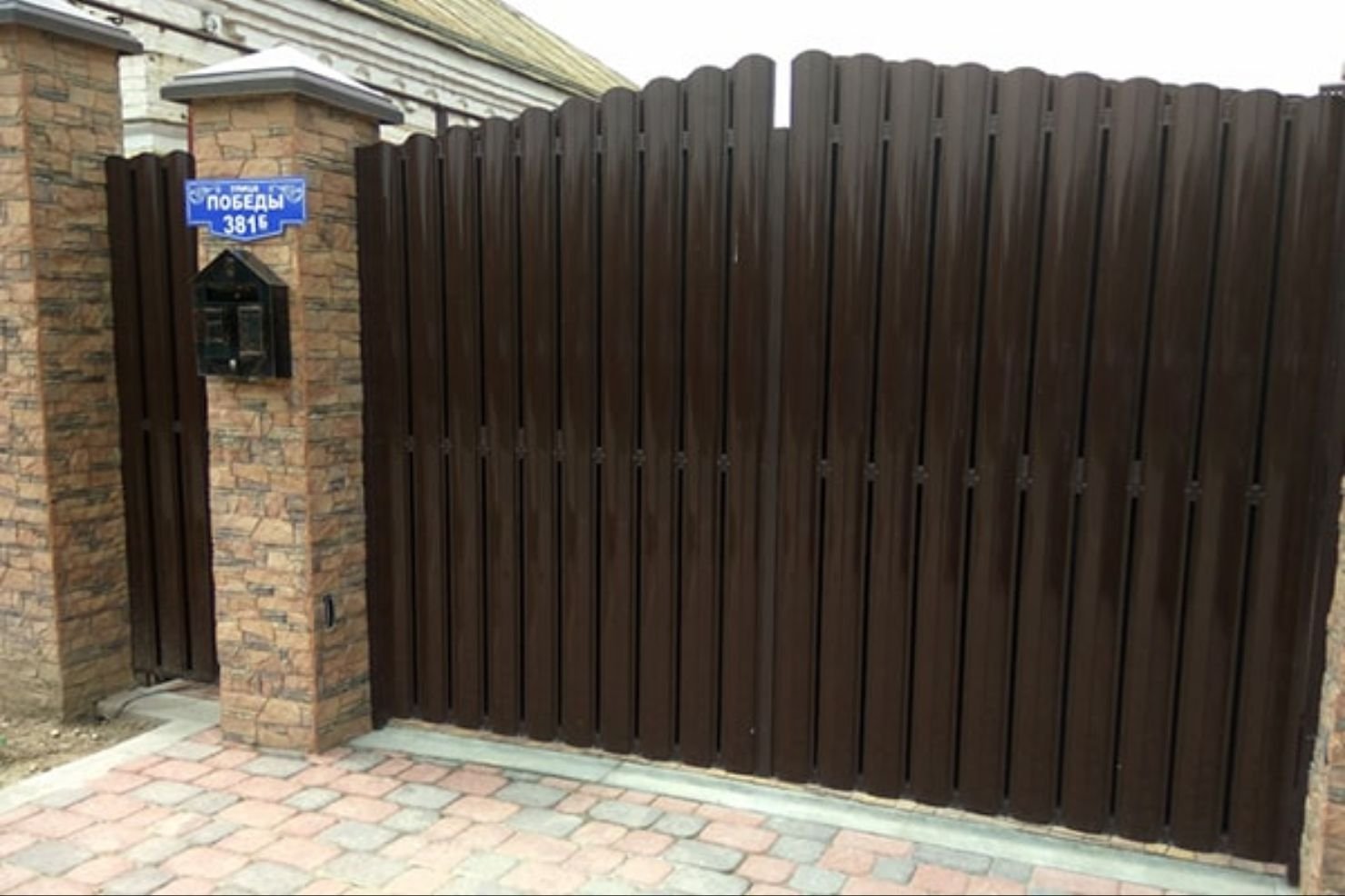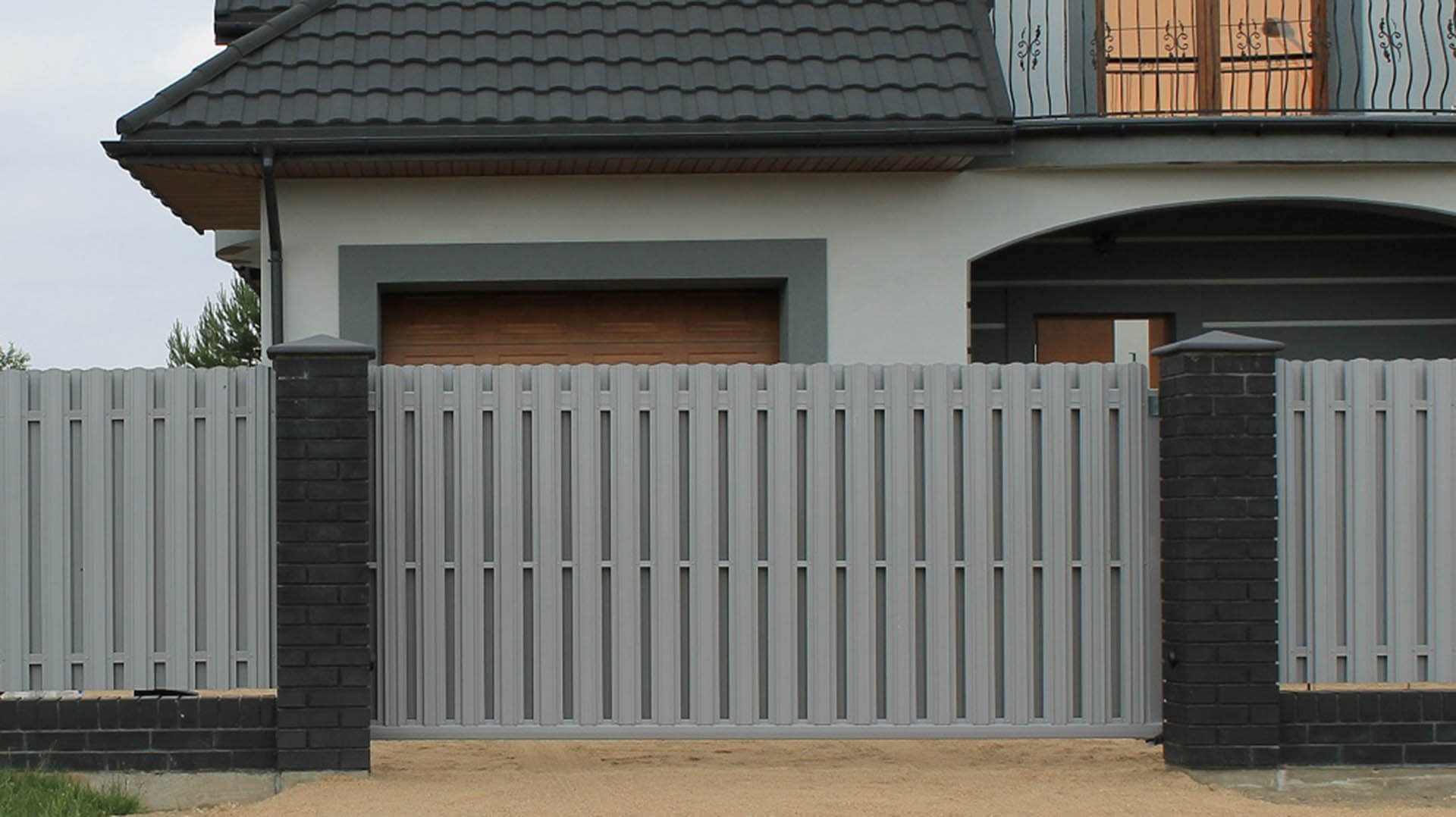 Заборы из евроштакетника с кирпичными столбами и откатными воротами