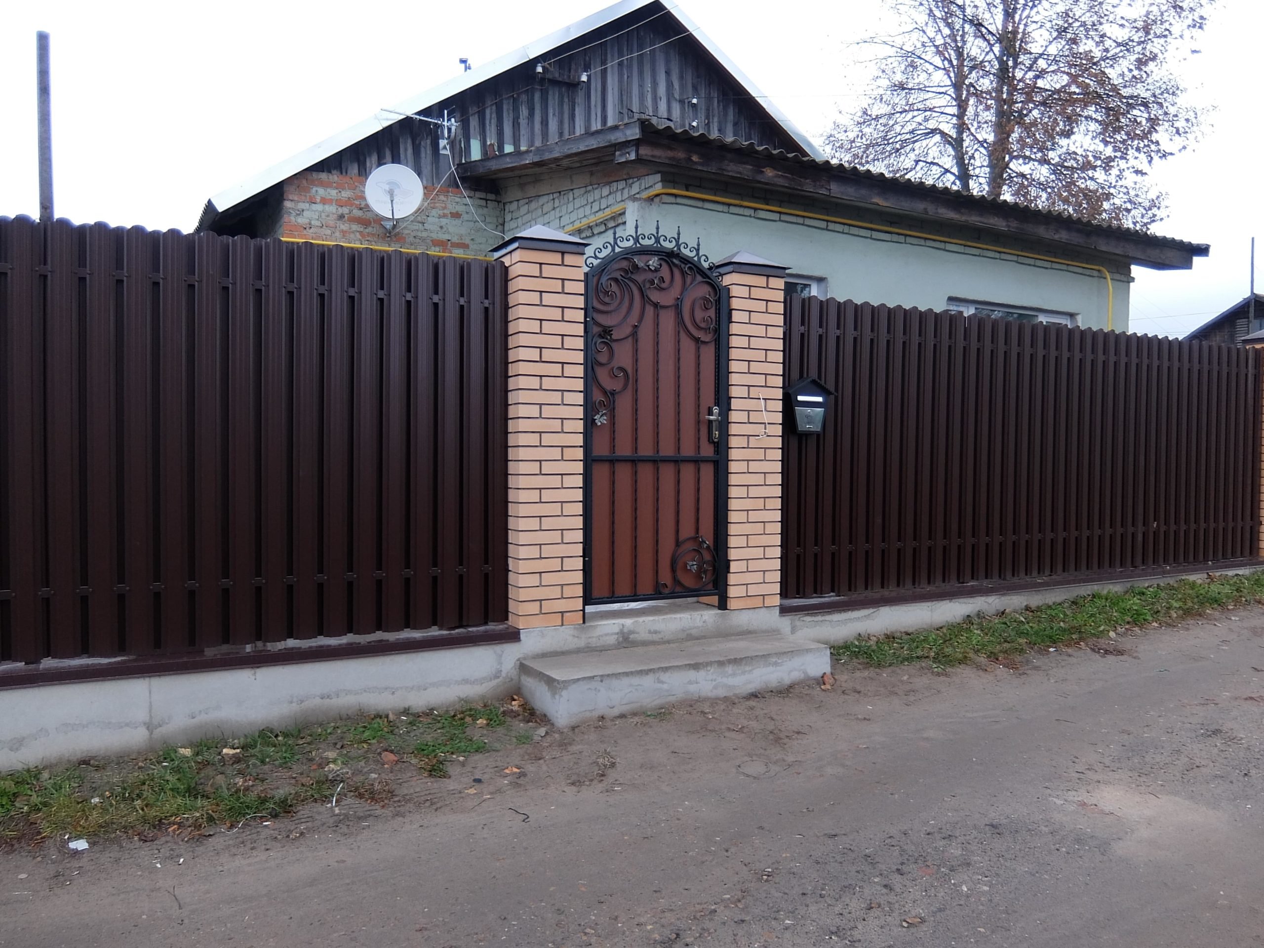 Забор из евроштакетника с коваными воротами