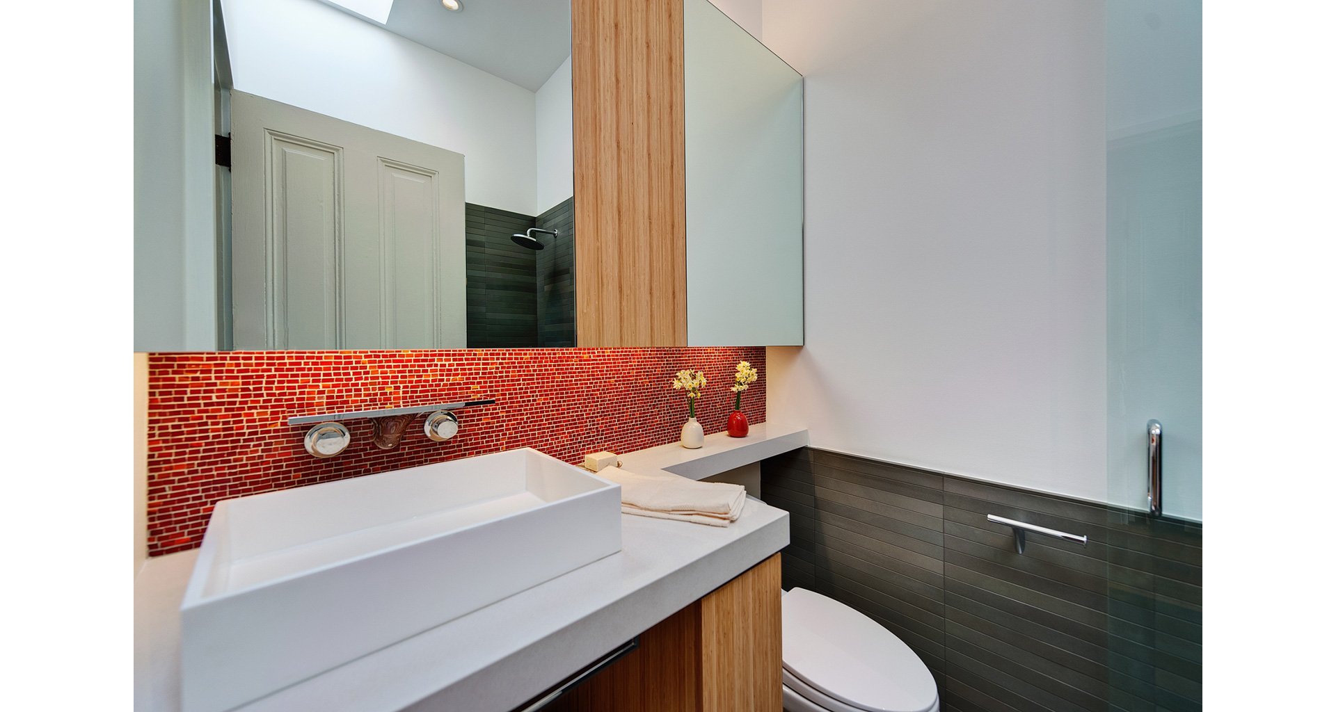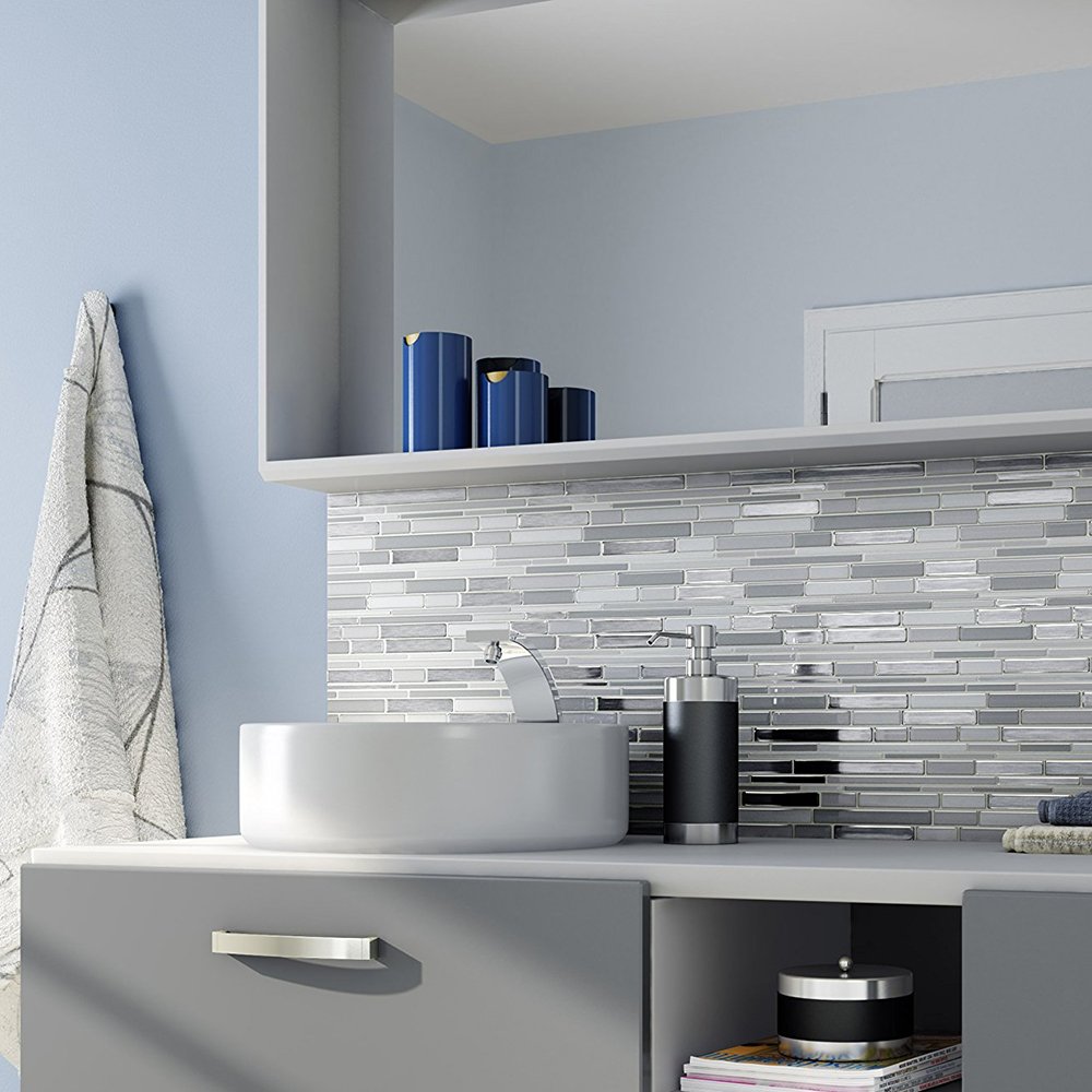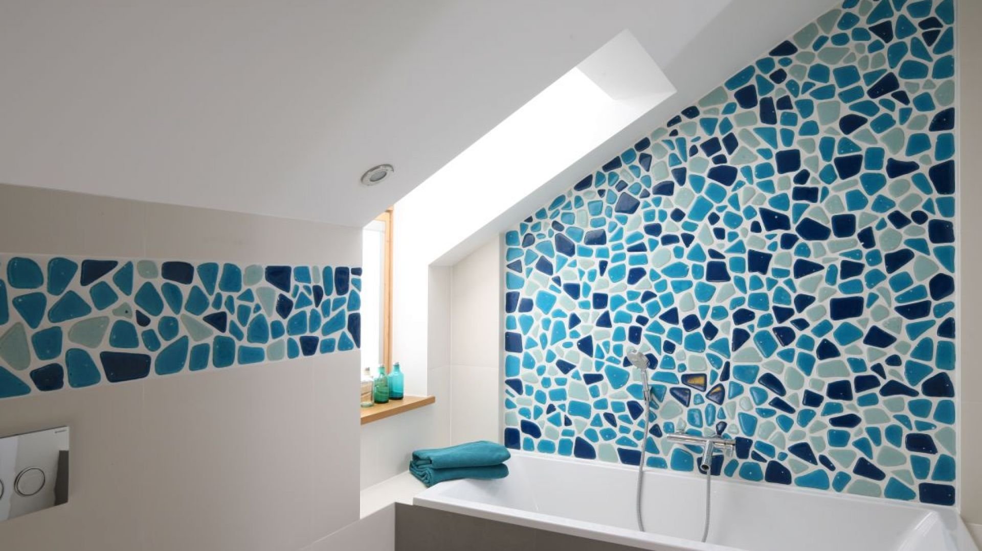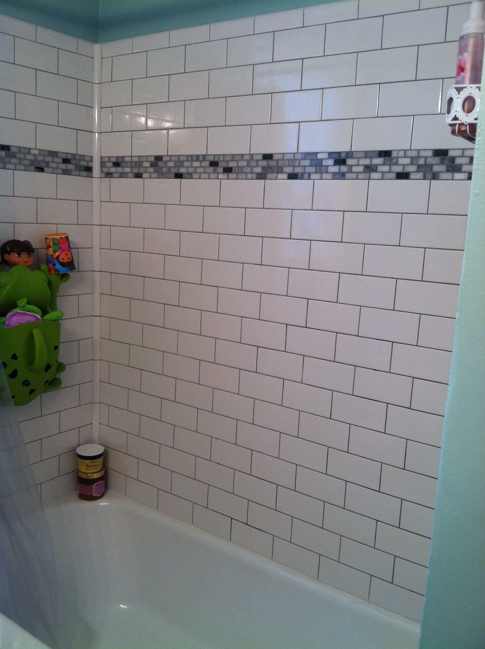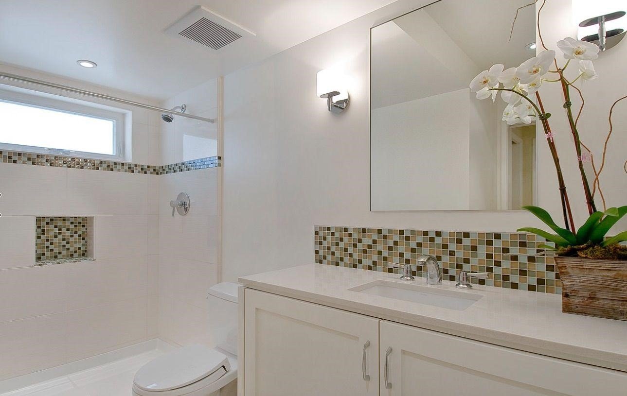 Ванная с белой плиткой и мозаикой