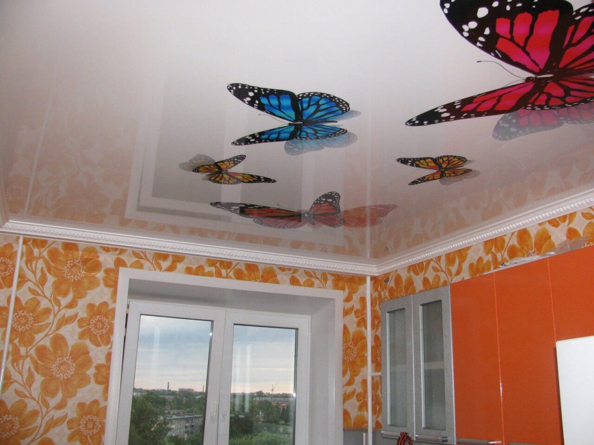 Фотопечать на натяжных потолках для кухни с бабочками