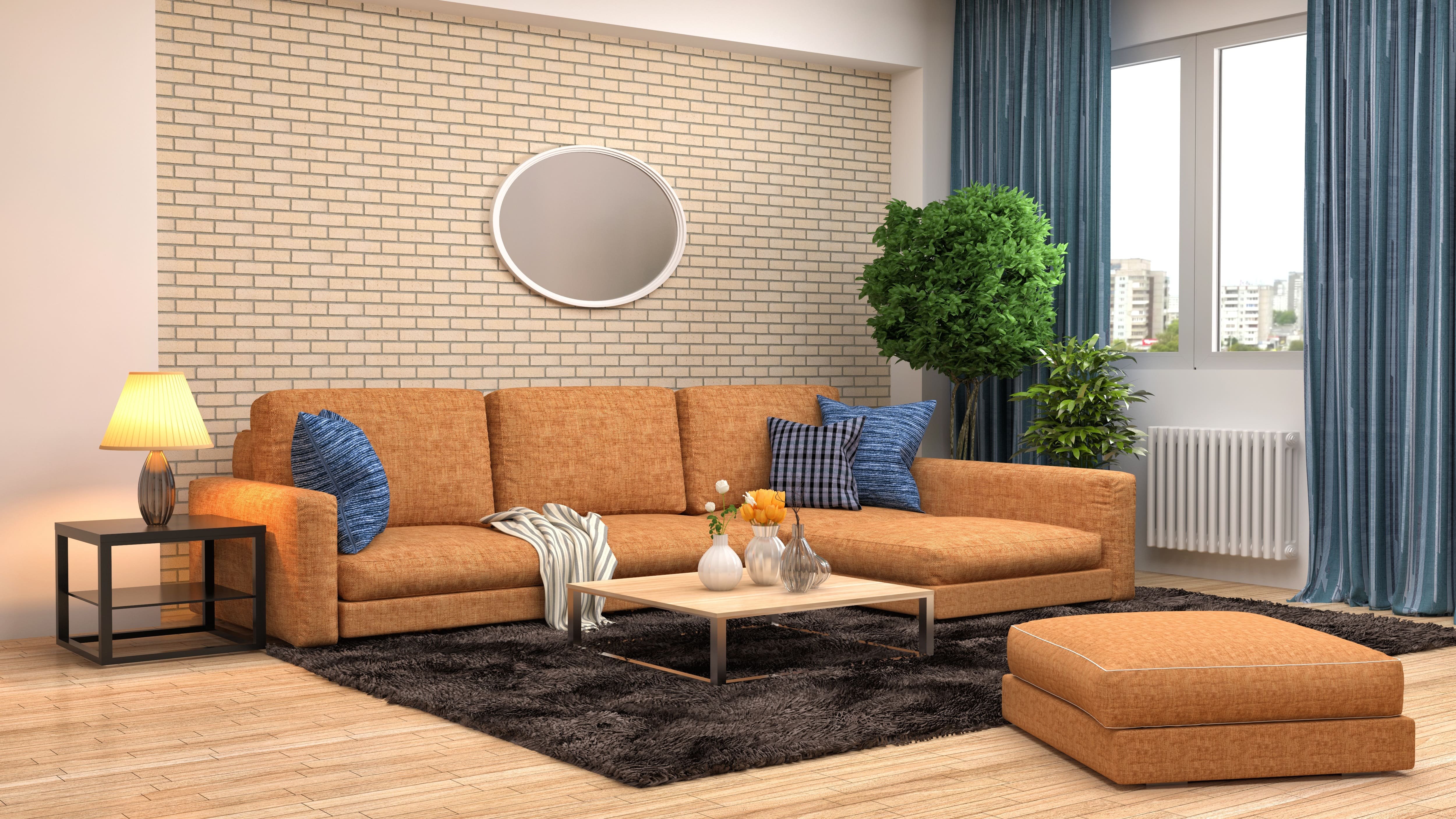Рыжий диван в интерьере гостиной
