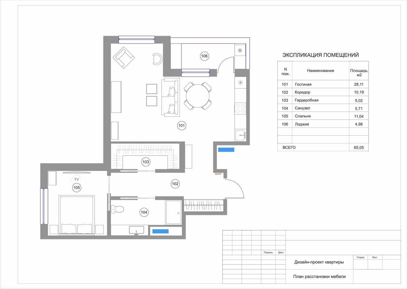 Чертеж спальной комнаты с санузлом