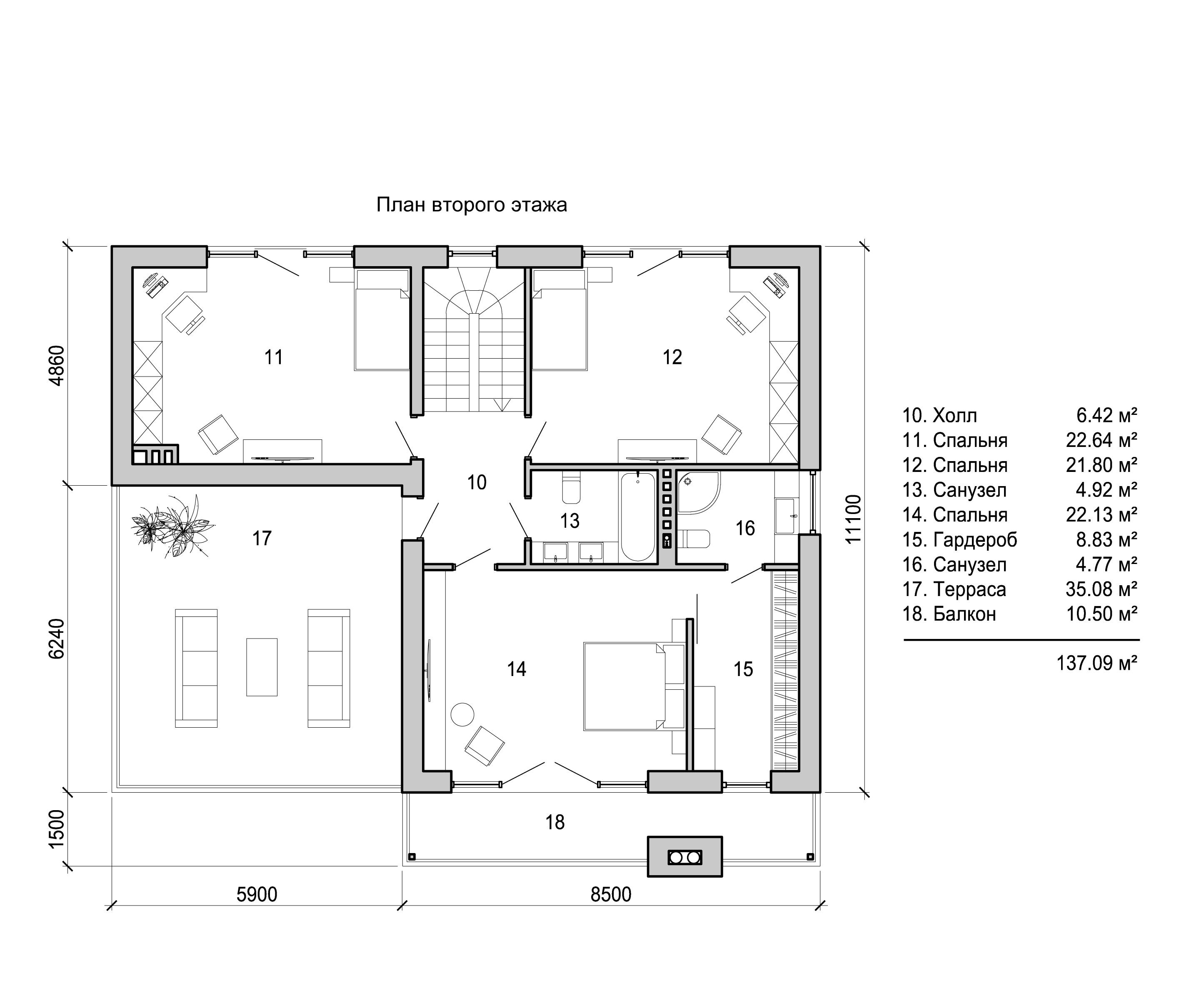 Планировка второго этажа с тремя спальнями и санузлом