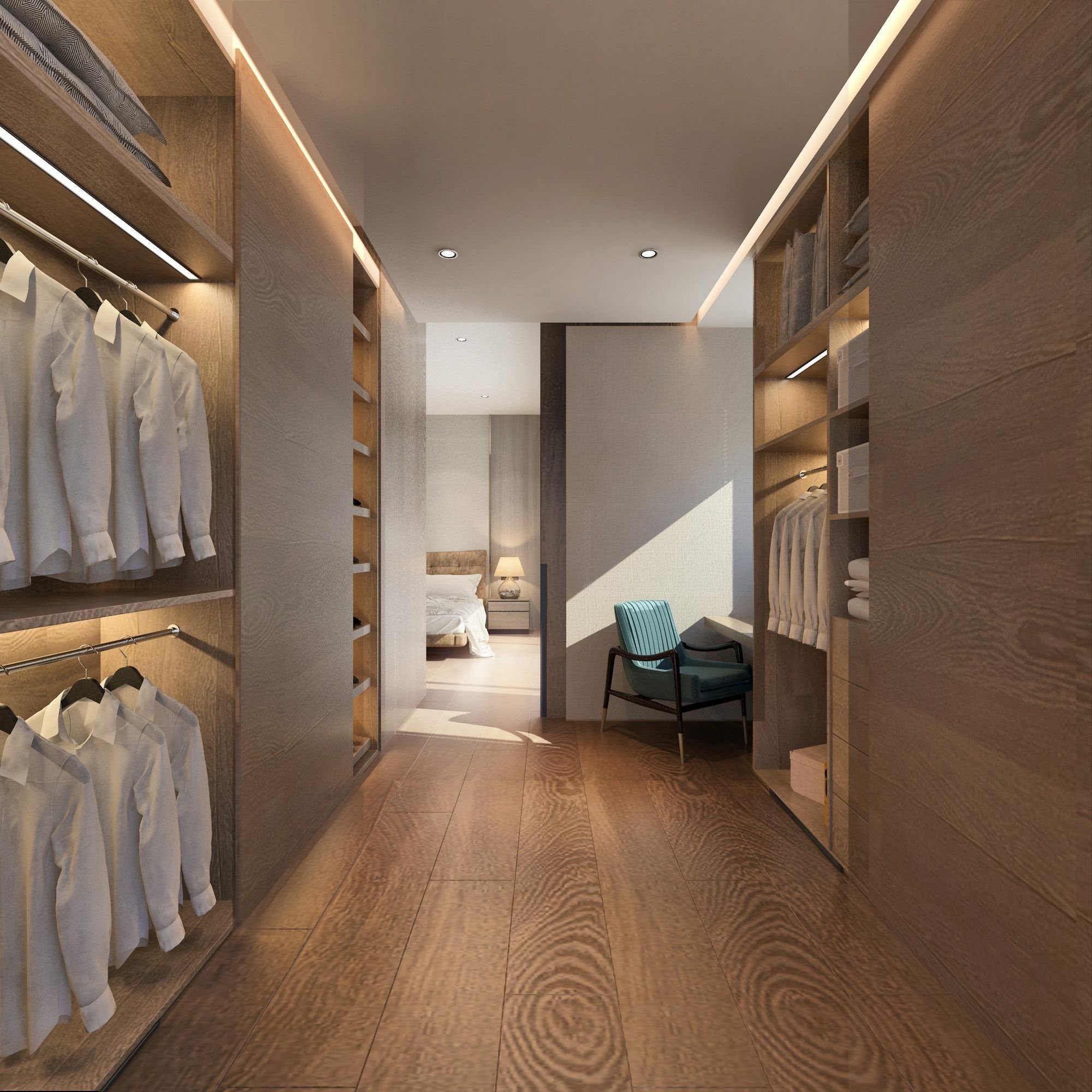 Узкая спальня с гардеробной