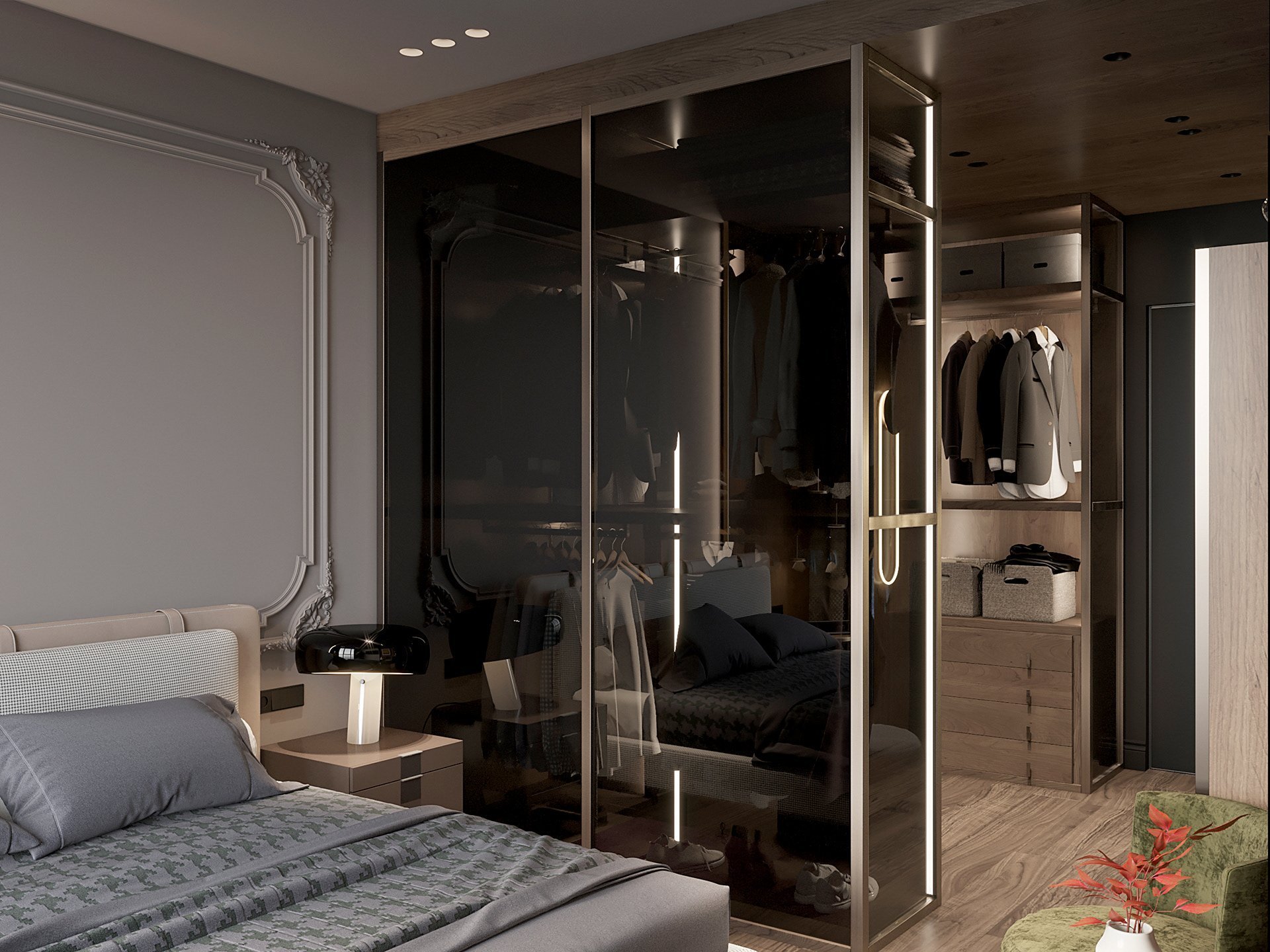 Стеклянная гардеробная в спальне